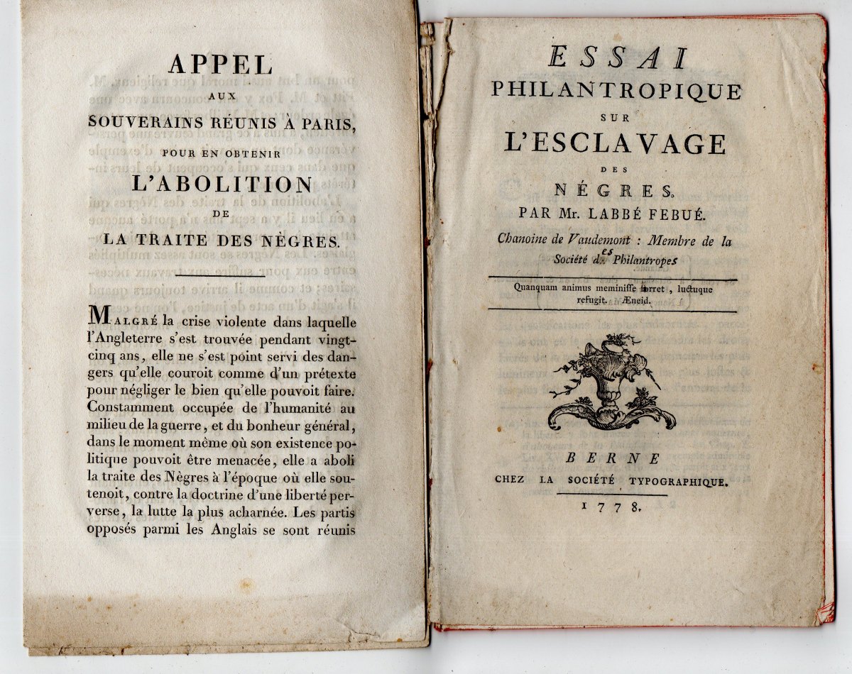 2 juillet 1789. A Versailles, de l'imprimerie royale, 1789, 3 pp., in-4 - Coup-d'il sur la question de la traite et de l'esclavage des Noirs, considérée dans son rapport avec le droit naturel. Momoro, [1790], 15 pp., in-8 - Lettre aux philantropes, sur les malheurs, les droits et les réclamations des gens de couleur de Saint-Domingue, et des autres isles françoises de l'Amérique. Par M. Grégoire, à Paris, octobre 1790, 21 pp., in-8 - Décret de la convention nationale qui supprime les primes pour la traite des esclaves, 27 juillet 1793. A Paris, de l'imprimerie naiotnale exécutive du Louvre, 1793, 2 pp., in-4 - Appel aux souverains réunis à Paris, pour en obtenir l'abolition de la traite des nègres. [Par Germaine de Staël, 1814], 7 pp., in-8 - etc.