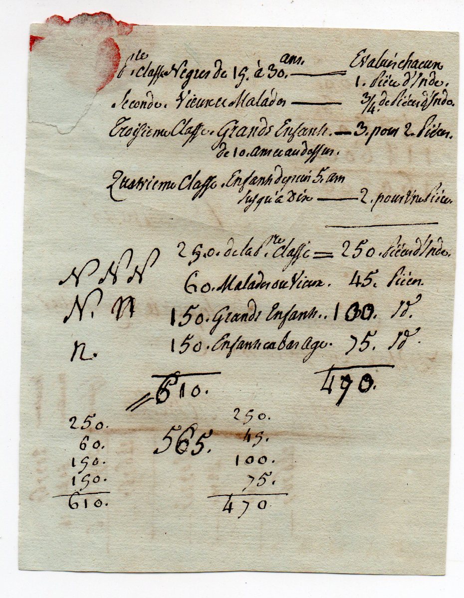 Joint: Billet-brouillon manuscrit autographe de Jean-Baptiste-François de La Porte sur lequel est reporté le prix des esclaves répartis par classe, 1 f.
