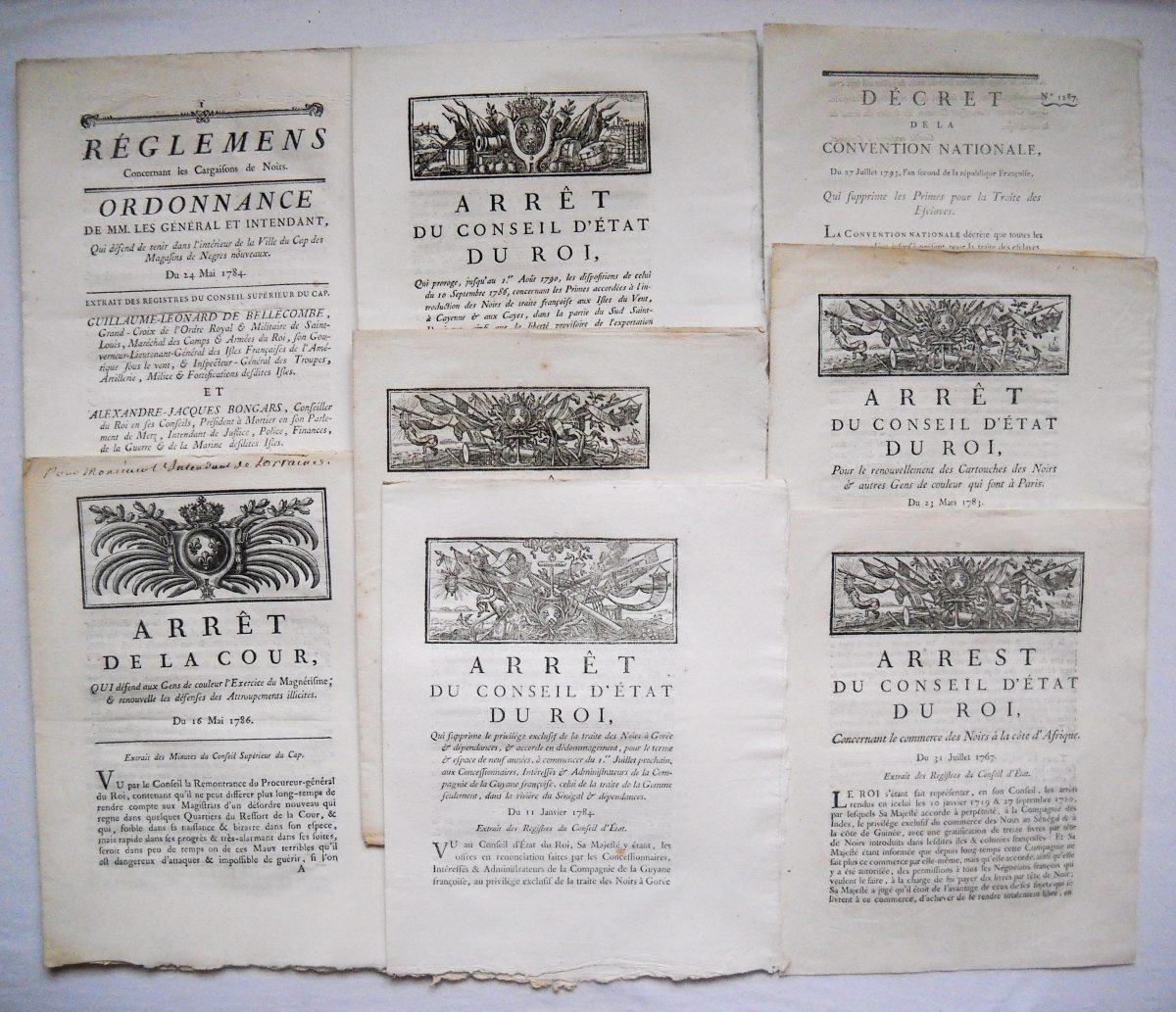Discours d'un nègre marron, qui a été repris, & qui va subir le dernier supplice. Par l'abbé Le Monnier, [1759], 7 pp., in-12 - Arrest du conseil d'état du roi concernant le commerce des noirs à la côte d'Afrique, 31 juillet 1767. A Paris, de l'imprimerie royale, 1767, 3 pp., in-4 - Essai philantropique sur l'esclavage des nègres par Mr. L'abbé Febué, chanoine de Vaudémont: membre de la société des philantropes. Berne, chez la société typographique, 1778, 48 pp., in-12 - Arrêt du conseil d'état du roi pour le renouvellement des cartouches des noirs & autres gens de couleur qui sont à Paris, 23 mars 1783. A Paris, de l'imprimerie royale, 1783, 4 pp., in-4 - Arrêt du conseil d'état du roi qui permet aux bâtimens étrangers arrivans directement des côtes d'Afrique, avec des cargaisons de cent quatre vingts noirs, au moins, d'aborder dans le port principal de chacune des îles de la Martinique, Guadeloupe,