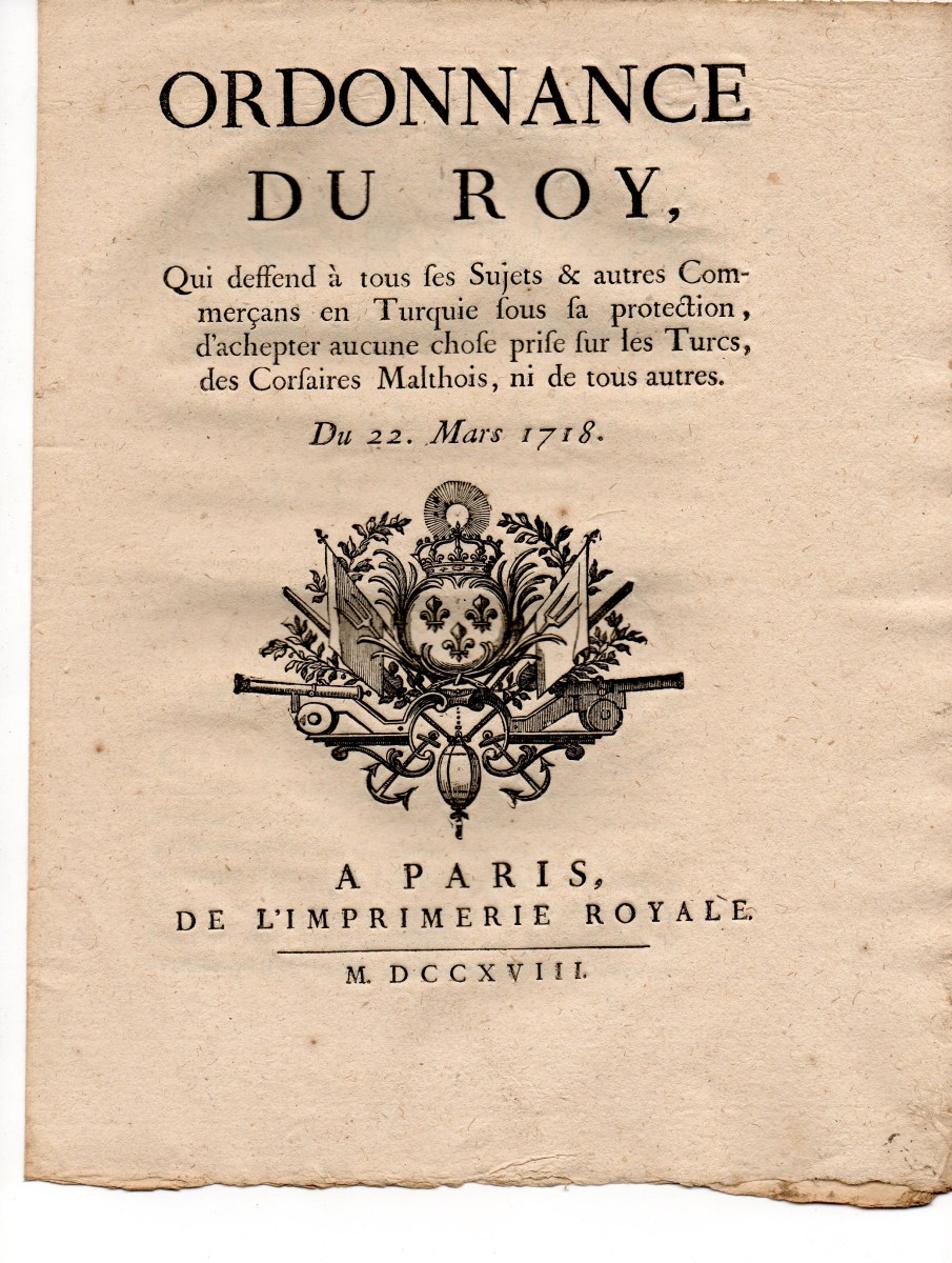 Ordonnance du roy qui deffend à tous ses sujets & autres commerçans en Turquie sous sa protection, d'achepter aucune chose prise sur les Turcs, des corsaires Malthois, ni de tous autres, 22 mars 1718. A Paris, de l'imprimerie royale, 1718, 4 pp., in-4 - Ordonnance du roy qui deffend aux capitaines des vaisseaux & bastimens françois, d'embarquer en Levant aucun François ou Estranger, sans la permission par écrit de l'Ambassadeur du roy à Constantinople, ou des consuls des Echelles, 24 octobre 1719. A Paris, de l'imprimerie royale, 1719, 4 pp., in-8 - Ordonnance du roy portant reglement sur ce qui doit estre observé dans les Echelles de Levant & de Barbarie, de la part des Juifs & autres Estrangers qui y jouissent de la protection de France, 4 février 1727. A Paris, de l'imprimerie royale, 1727, 4 pp., in-4 - Déclaration du roy concernant la navigation des vaissaux français aux côtes d'Italie, d'Espagne, de Barbarie et aux Echelles du Levant, 21 octobre 1727. A Paris, de l'imprimerie royale, 1728, 15 pp., in-8 - Ordonnance du roy qui fixe à 10 ans la résidence des negocians & artisans François dans les Eschelles de Levant & de Barbarie, 21 mars 1731. A Paris, de l'imprimerie royale, 1731, 4 pp., in-4 - etc.