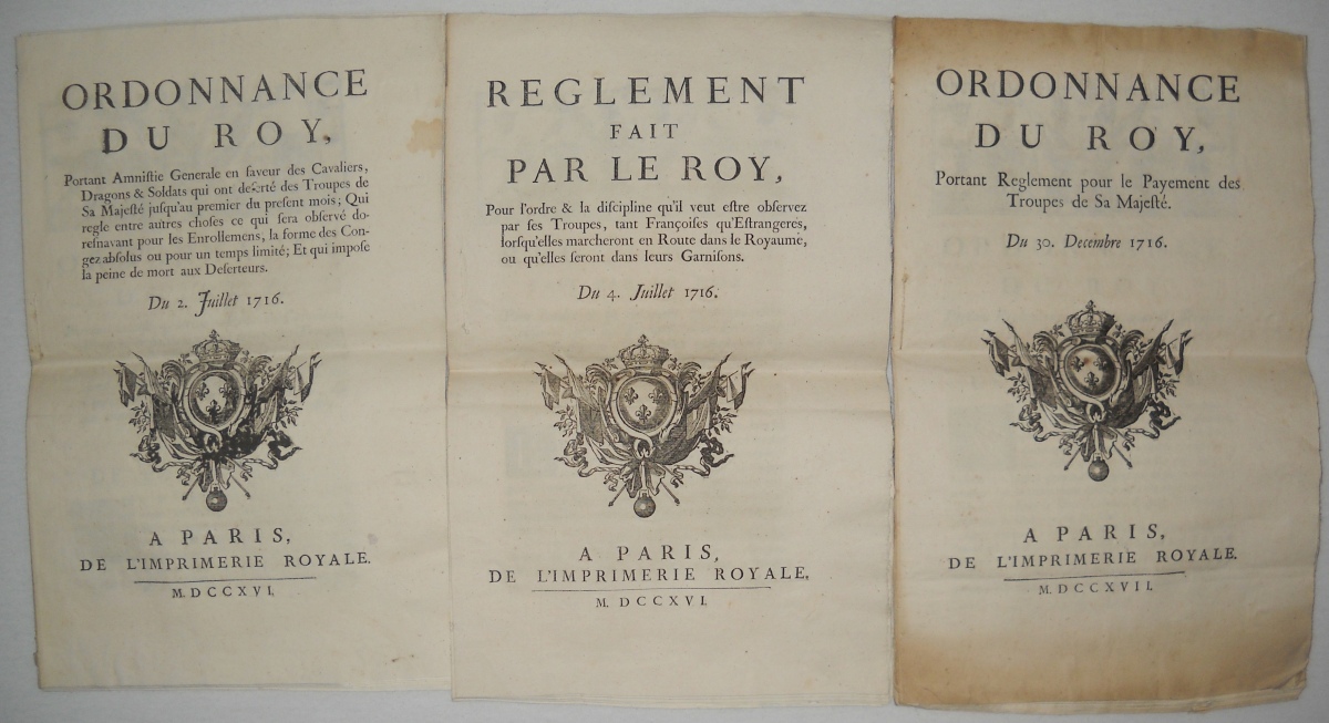 [MILITARIA - GUERRE - ARMÉE] - Edits, déclarations, ordonnances et arrêts du conseil d'état du roi, arrêts de la cour de parlement et divers, relatifs à l'armée et aux conflits sous la Régence et le règne de Louis XV.