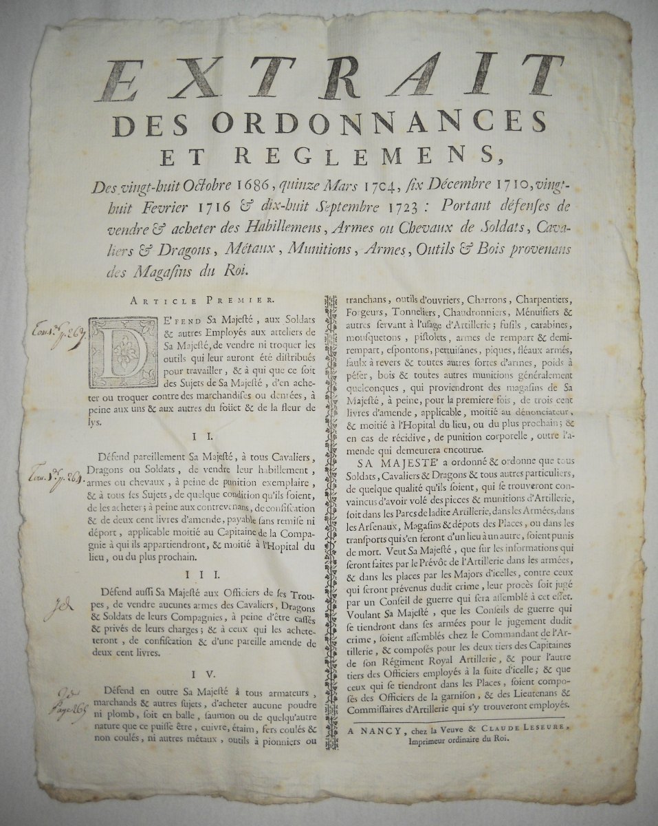 ![Lot 62 - [MILITARIA - GUERRE - ARMÉE] - Edits, déclarations, ordonnances et... [MILITARIA - GUERRE - ARMÉE] - Edits, déclarations, ordonnances et...](<150:ddoc-446790-1d7acce3508bc7e3ec847e688b11ee0e-65_7.jpg, <480:ddoc-446791-2a3be6e4fa128cda514e1fe2118eadeb-65_7.jpg, <640:ddoc-446792-e669a17e2dde3ee9e769c5a3e924f553-65_7.jpg, <900:ddoc-446793-75c4279a40940618d2a9b03aa08f3184-65_7.jpg, >900:ddoc-446789-4dd7220532d7511f10f8a7d30946913f-65_7.jpg)