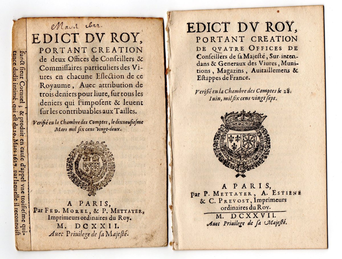 le 19 mars 1622. A Paris, par Fed. Morel & P. Mettayer, 1622, 16 pp., in-16 - Edict du roy portant creation de quatre offices de conseillers de Sa Majesté, surintendans & generaux des vivres, munitions, magazins, avitaillemens & estappes de France, le 28 juin 1627. A Paris, par P. Mettayer, A. Estiene & C. Prevost, 1627, 14 pp., in-16 - Edict du roy par lequel toutes les commissions expédiées aux commissaires des guerres pour la conduite des gens de guerre, tant de cheval que de pied, sont créées en tiltre d'offices