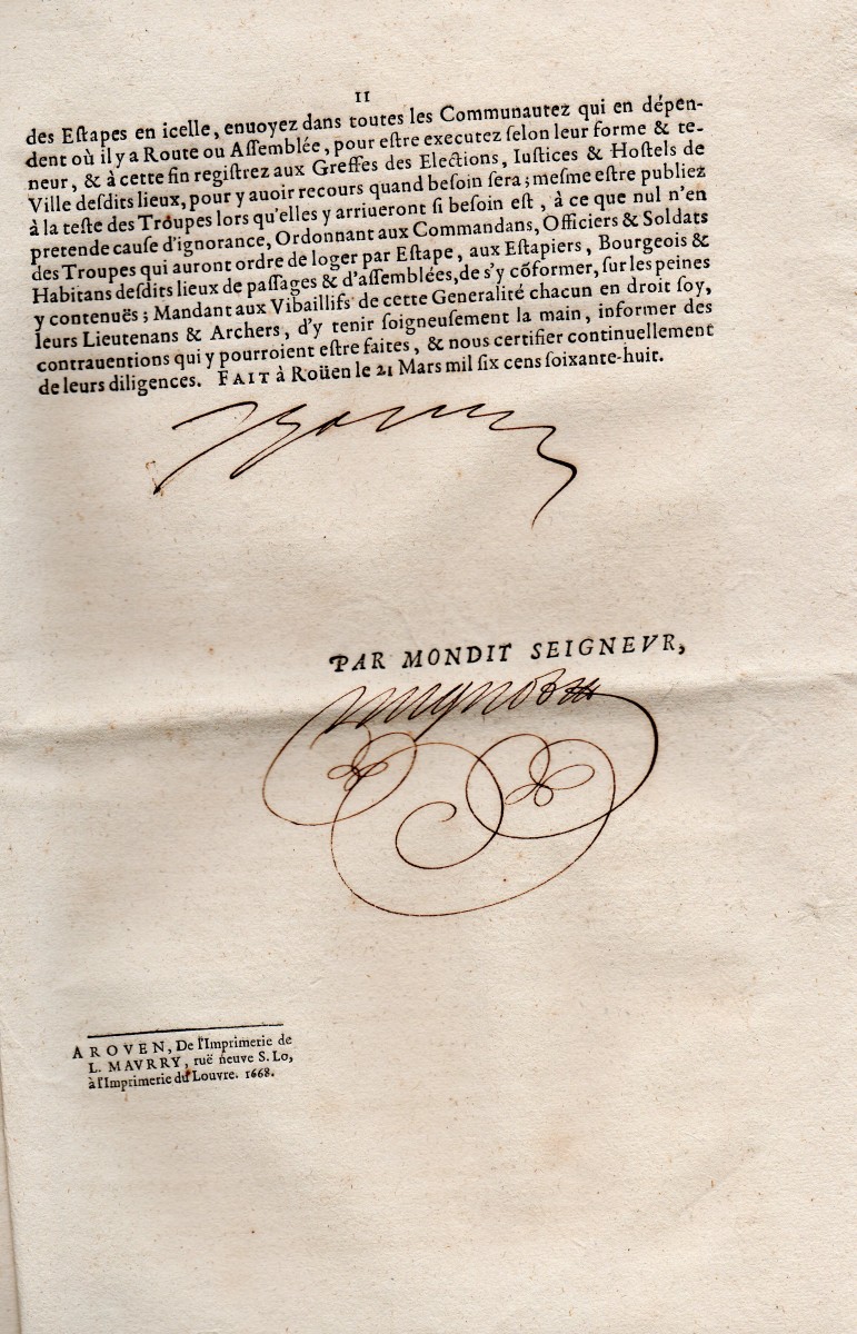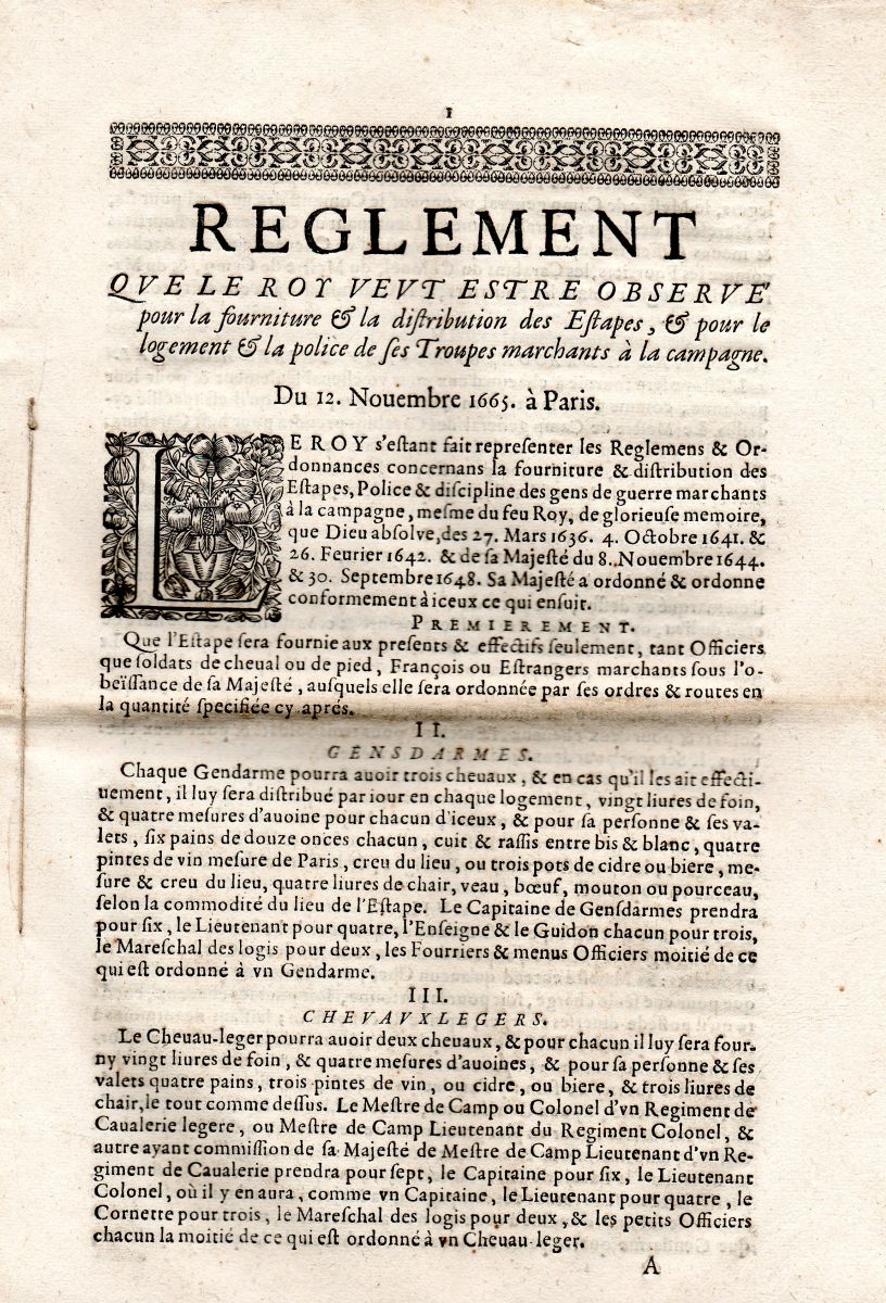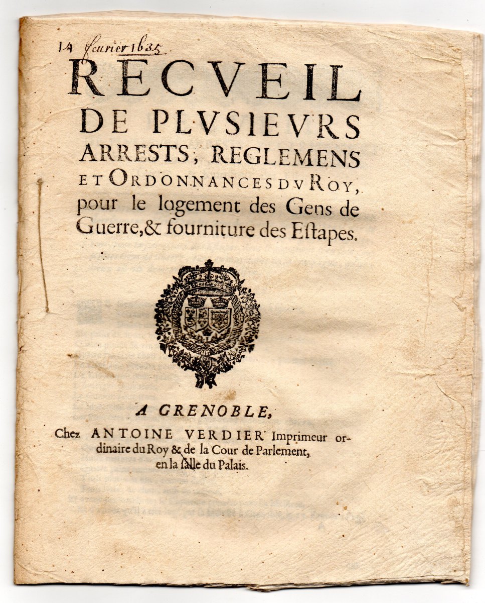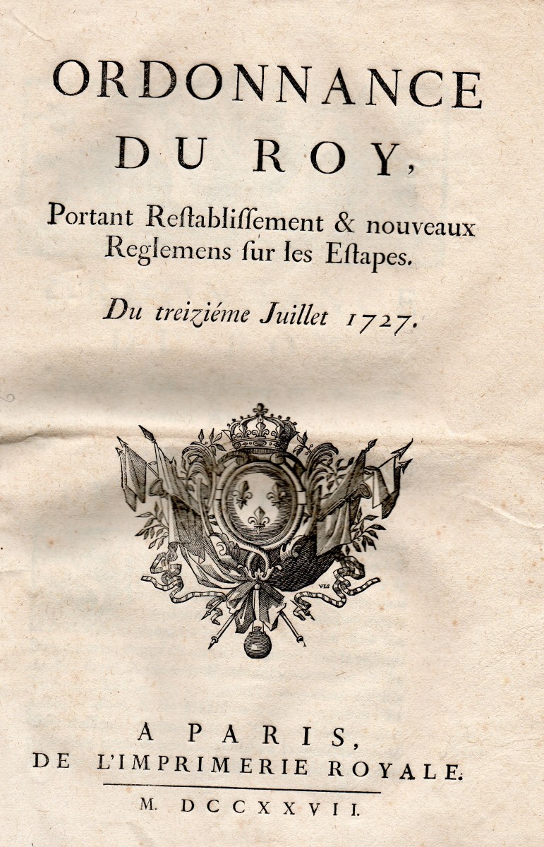A Paris, par P. Mettayer, A. Estiene & C. PRevost, 1630, 24 pp., in-16 - Lettres patentes du roy & arrest de la cour des aydes pour l'exemption des commissaires ordinaires des guerres. A Paris, par P. Mettayer, A. Estiene, 1634, 8 pp., in-16 - Edict du roy portant creation & suppression des surintendans & commissaires des vivres. A Paris, par P. Mettayer, A. Estiene, 1635, 14 pp., in-16 - Recueil de plusieurs arrests, reglemens et ordonnances du roy, pour le logement des gens de guerre & fourniture des estapes. A Grenoble, chez Antoine Verdier, 1653, 38 pp., in-8 - Reglement que le roi veut estre observe pour la fourniture & la distribution des estapes, & pour le logement & la police de ses troupes marchant à la campagne. 1668, 11 pp., in-fol. - Edit du roy portant creation de commissaires particuliers aux revues & logemens de gens de guerre. A Paris, chez Guillaume Desprez, 1692, 7 pp., in-8 - Déclaration du roy en forme de reglement pour la décharge des munitionnaires des vivres, le 7 juin 1701. A Paris, chez François Muguet, 1701, 7 pp., in-4 - Edit du roy portant creation de trente offices de commissaires provinciaux des guerres. A Paris, chez la veuve François Muguet & Hubert Muguet, 1704, 11 pp., in-8 - Ordonnance du roy portant restablissement & nouveaux reglemens sur les estapes, du 13 juillet 1727. A Paris, de l'imprimerie royale, 1727, 29-VII pp., infol. - Ordonnance du roy pour faire fournir du pain de munition aux troupes, sur les frontieres, du 10 aoust 1733. A Paris, de l'imprimerie royale, 1733, 4 pp., in-4 - etc.
