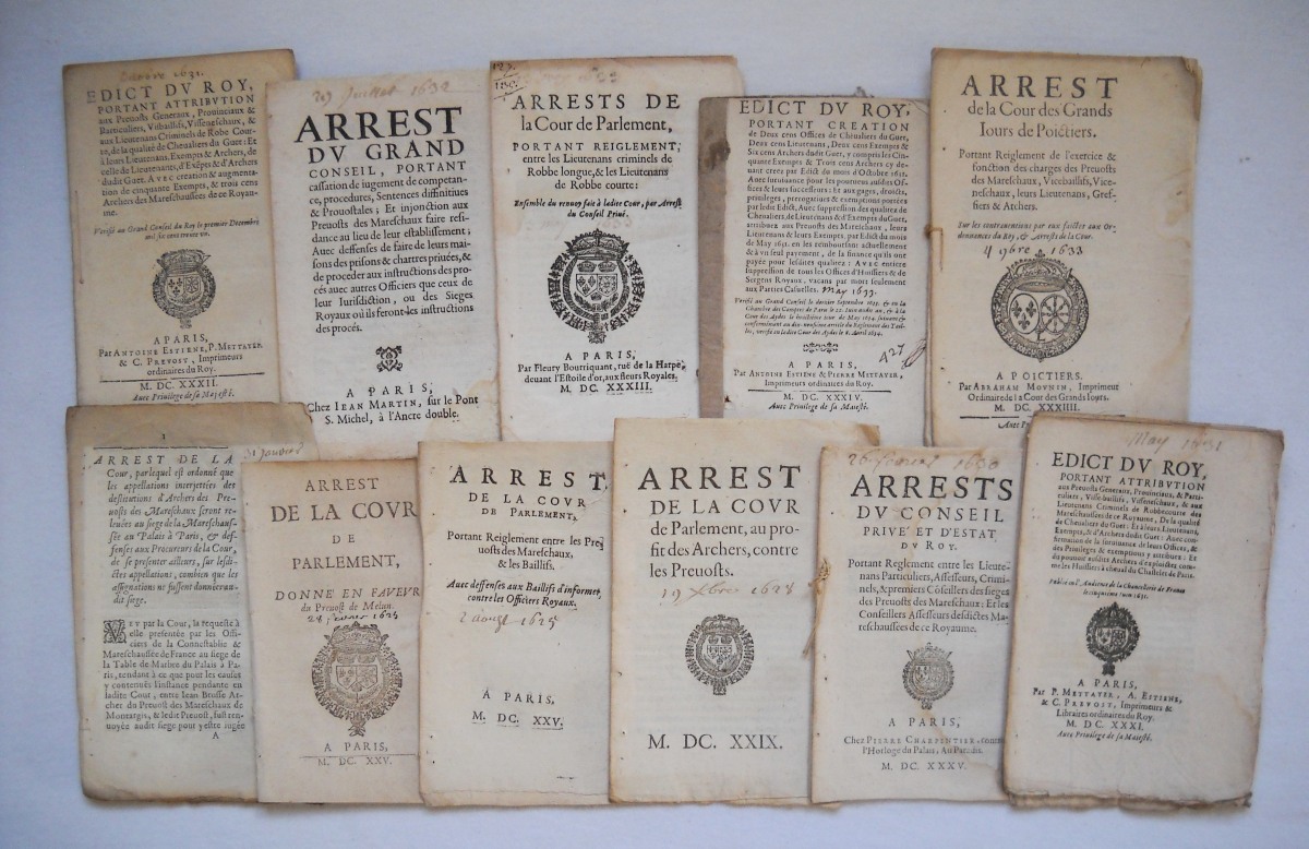 [MARÉCHAUSSÉE] - Lettres patentes, édits, déclarations, ordonnances, arrêts du conseil d'état du roi, arrêts de la cour de parlement, et divers, relatifs à la connétablie et à la maréchaussée de France.