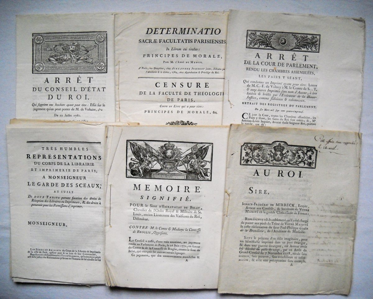 8 pp., in-4 - Arrêt du conseil d'état du roi qui supprime une brochure ayant pour titre: Essai sur le jugement qu'on peut porter de M. de Voltaire, &c. 22 juillet 1780. A Paris de l'imprimerie royale, 1780, 3 pp., in-4 - Arrêt du conseil d'état du roi portant règlement pour la vente des bibliothèques, 1er juin 1781. A Paris de l'imprimerie royale, 1781, 3 pp., in-4 - Censure de la faculté de théologie de Paris contre un livre qui a pour titre: Principes de morales, &c. A Paris, Clousier, 1784, 29 pp., in-4 - Arrêt du conseil d'état du roi concernant les imrpimeurs qui sont pourvus du titre d'imprimeurs de Sa Majesté, 2 avril 1785. A Paris de l'imprimerie royale, 1785, 3 pp., in-4 - Arrêt du conseil d'état du roi qui supprime l'ouvrage intitulé: Lettre du comte de Mirabeau, sur l'administration de M. Necker, 6 juin 1787. A Paris de l'imprimerie royale, 1787, 2 pp., in-4 - Arrêt du conseil du roi portant suppression de l'imprimerie potype, 1er novembre 1787. A Paris de l'imprimerie royale, 1787, 3 pp., in-4 - Arrêt du conseil d'état du roi qui supprime le n°1 d'une feuille périodique, ayant pour titre: Etats généraux ; & qui fait défenses d'en publier la suite, 7 mai 1789. A Paris de l'imprimerie royale, 1789, 3 pp., in-4 - Arrêt du conseil d'état du roi qui ordonne la réunion de l'imprimerie du cabinet à l'imprimerie royale du Louvre, & l'établissement d'un détachement de ladite imprimerie royale à Versailles, 23 mai 1789. A Paris de l'imprimerie royale, 1789, 3 pp., in-4 - etc.