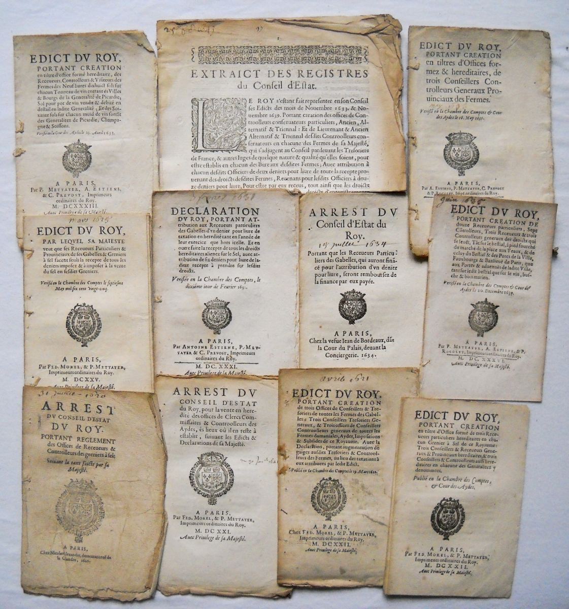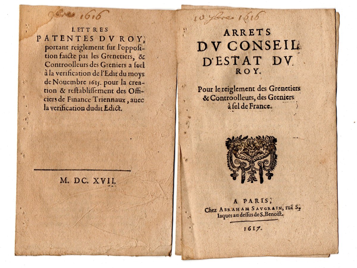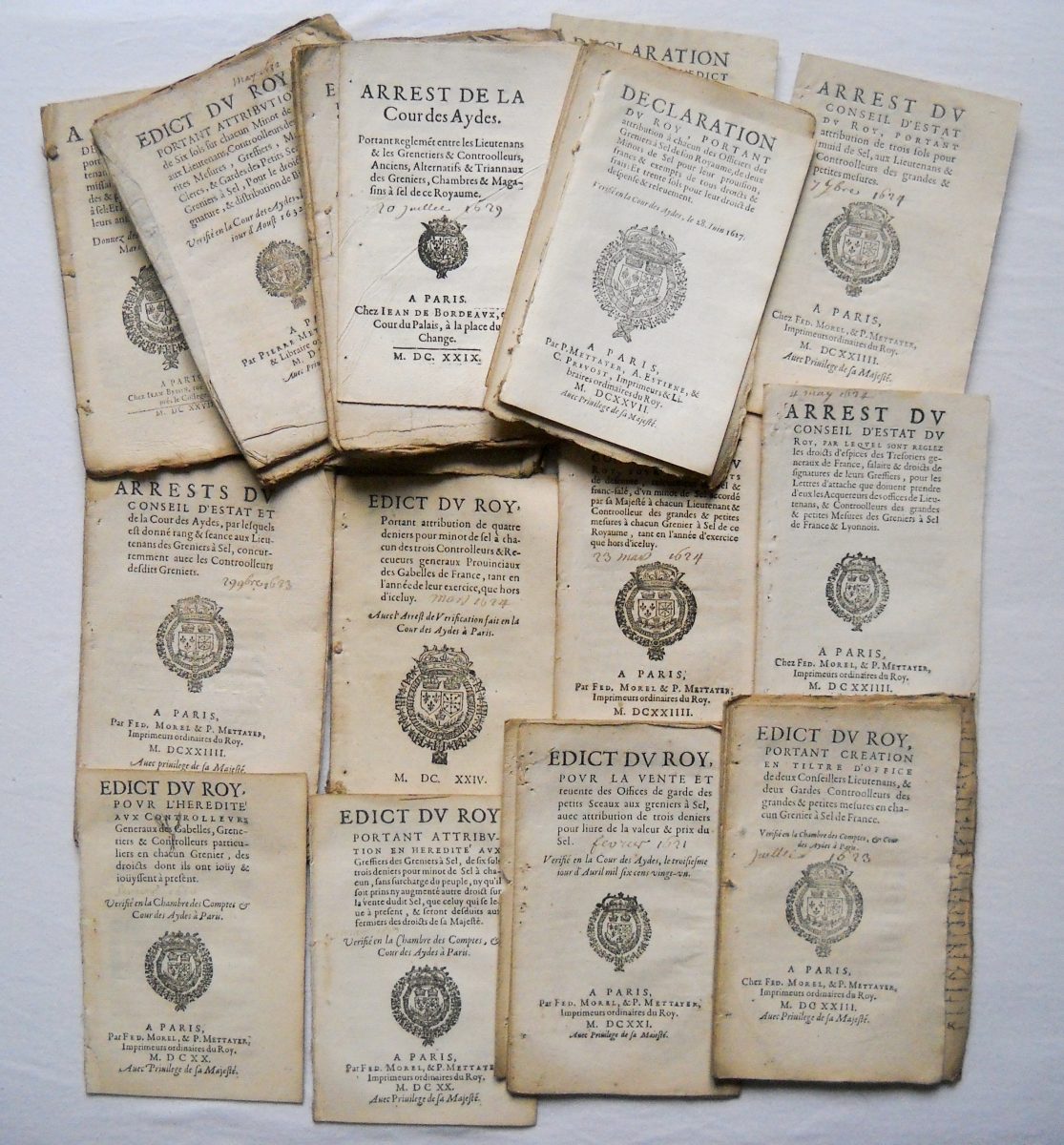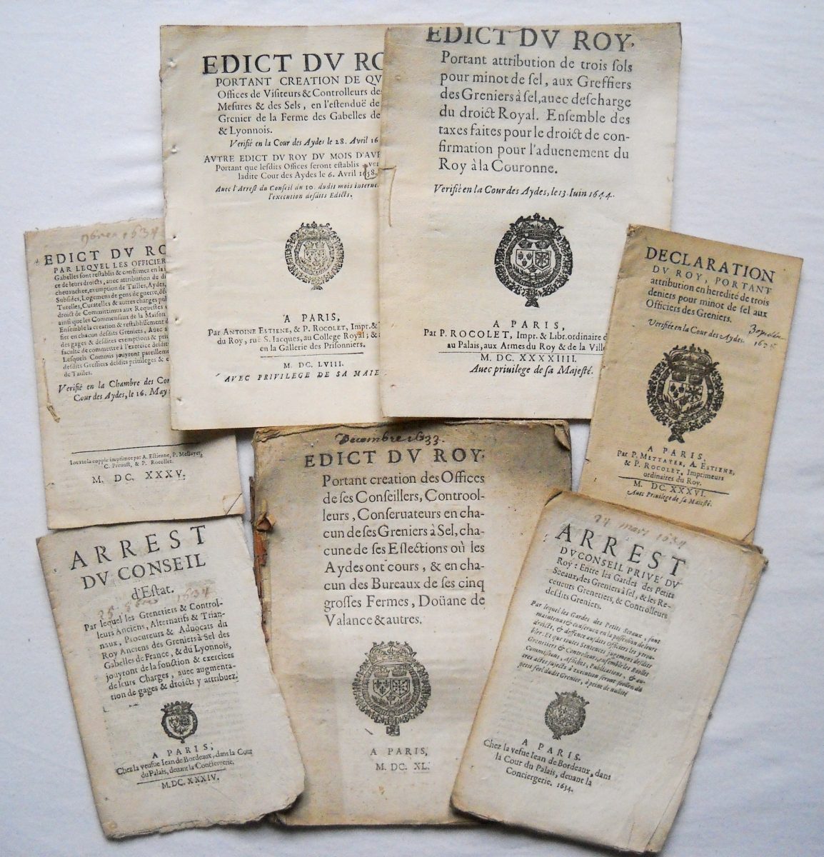 A Paris, 1622, 14 pp., in-12 - Edict du roy portant creation en tiltre d'office de deux conseillers lieutenans & deux gardes controlleurs des grands & petites mesures en chacun grenier à sel de France. A Paris chez Fed. Morel & P. Mettayer, 1623, 52 pp., in-12 - Edict du roy portant creation des offices des gabelles à sel de cette province de Dauphiné. A Grenoble, chez Pierre Verdier, 1629, 16 pp., in-12 - Déclaration du roy portant attribution à chacun des officiers des greniers à sel de ce royaume, de deux minots de sel pour leur provision, francs & exempts de tous droicts & frais