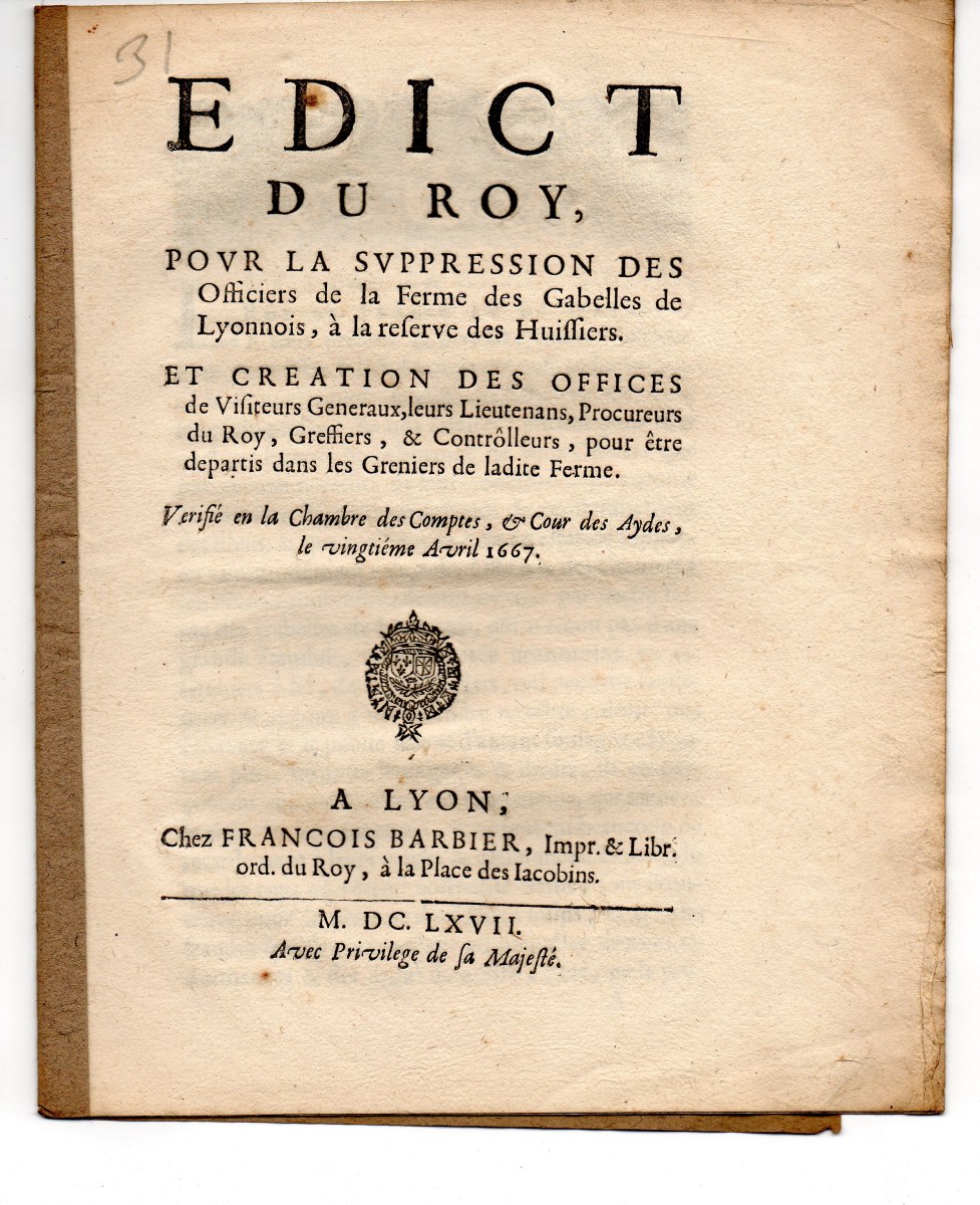 Frederic Leonard, 18 pp., in-fol. - Edit du roy portant création des offices de conseillers du roy, controlleurs des receveurs des gabelles de France, février 1704. A Paris, Frederic Leonard, 1704, 8 pp., in-8 - Déclaration du roy concernant les offices de présidents dans les greniers à sel, 24 aoust 1720. A Paris, de l'imprimerie royale, 1720, 4 pp., in-8 - etc.