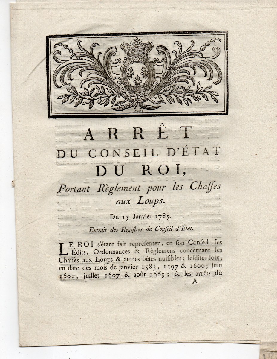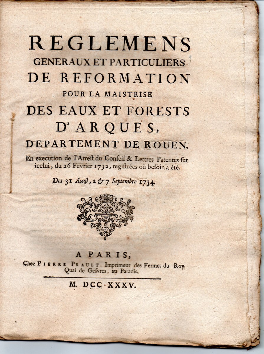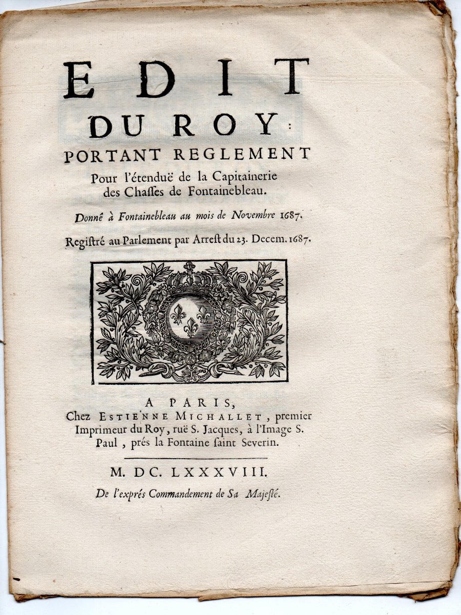A Paris, par P. Mettayer, A. Estiene & P. Rocolet, 1637, 15 pp., in-16 - Arrests de la cour de parlement de Dauphiné concernans le port des armes defendues et reglement general pour le faict de la chasse & de la pesche. 1659, 4 pp., in-8 - Edict du roy pour faire couper dans les forests de Sa Majesté, jusques à la somme de douze cens mille livres de bois, par ventes extraordinaires. A Paris, 1653, 6 pp., in-8 - Edict du roy portant reglement general pour les eaux & forests. A Paris chez Frederic Leonard, 1669, 94 pp. et table, in-8 - Arrest du conseil d'estat qui defend à tous lieutenans de la louverie & autres qui se pretendent officiers d'icelle, de faire aucune publication de chasse aux loups, que du consentement de deux gentilshommes de l'étendue de leur département, qui seront nommez par les commissaires départis esdites provinces, 3 juin 1671. A Paris, par Sébastien Mabre-Cramoisy, 1671, 4 pp., in-8 - Déclaration ud roy qui règle les départements des eaux et forests, décembre 1675. A Paris, par Sébastien Mabre-Crazmoisy, 1676, 8 pp., in-4 - Déclaration du roy concernant le fait des chasses. A Paris, chez Antoine Fournot, 1687, 4 pp., in-8 - Edit du roy pour l'étendue de la capitainerie des chasses de Fontainebleau, novembre 1687. A Paris, chez Estienne Michallet, 1688, 7 pp., in-4 - Edit du roy portant creation de seize grands maistres des eaux & forests. A Paris, chez Frederic Leonard, 1689, 10 pp., in-8 - Déclaration du roy portant reglement pour la capitainerie royale des chasses de Blois, 21 avril 1698. A Paris, chez François Muguet, 1698, 4 pp., in-8 - Reglement au sujet des capitaineries royales des chasses, octobre 1707. 37 x 49 cm - Edit du roy qui supprime les offices d'inspecteurs-conservateurs généraux des eaux & forêts & qui crée d'autres offices, mars 1708. A Paris, de l'imprimerie royale, 1743, 20 pp., in-4 - Ordonnance du roy concernant la chasse & les braconniers. 1715, A Paris, chez Jean de la Caille, 3 pp., in-8 - Lettres patentes portant qu'il sera marqué quarante pieds d'arbres dans la forest de Chambord, pour le remplacement des poutres pourries au chasteau de Chambord, 24 novembre 1724. A Paris, chez Pierre Simon, 1725, 3 pp., in-4 - Ordonnance de reglement pour les chasses en exécution des ordres du roy, portant défenses à toutes personnes de quelque qualité & condition qu'elles soient, de chasser pendant deux années dans l'étendue de la capitainerie de la Varenne du Louvre, 29 aoust 1726. A Paris, chez la veuve Saugrain & Pierre Prault, 1726, 7 pp., in-4 - Reglemens generaux et particuliers de reformation pour la maitrise des eaux et forets d'Arques, département de Rouen. A Paris, chez Pierre Prault, 1735, 27 pp., in-4 - Edit du roy portant création d'une maistrise particulière des eaux & forests en la ville de Pau, avril 1738. A Paris, de l'imprimerie royale, 1738, 12 pp., in-4 - Sentence de la capitainerie royale des chasses de la varenne des Tuileries portant condamnation de peines corporelles, bannissement & amende, contre les braconniers, colporteurs & acheteurs de gibier, vendeurs de filets, & autres délinquans y dénommez, 4 septembre 1738. A Paris, de l'imprimerie royale, 1738, 20 pp., in-4 - Arrêt du conseil d'état du roi, portant règlement pour les chasses aux loups, 15 janvier 1785. A Paris, de l'imprimerie royale, 1785. 7 pp., in-4 - Ordonnance du roi concernant la chasse, 10 août 1789. A Paris, chez N.H. Nyon, 1789, 2 pp., in-4 - Edit du roi portant suppression de la capitainerie de Chambord, septembre 1777. A Paris, chez P.G. Simon, 4 pp., in-4 - etc.