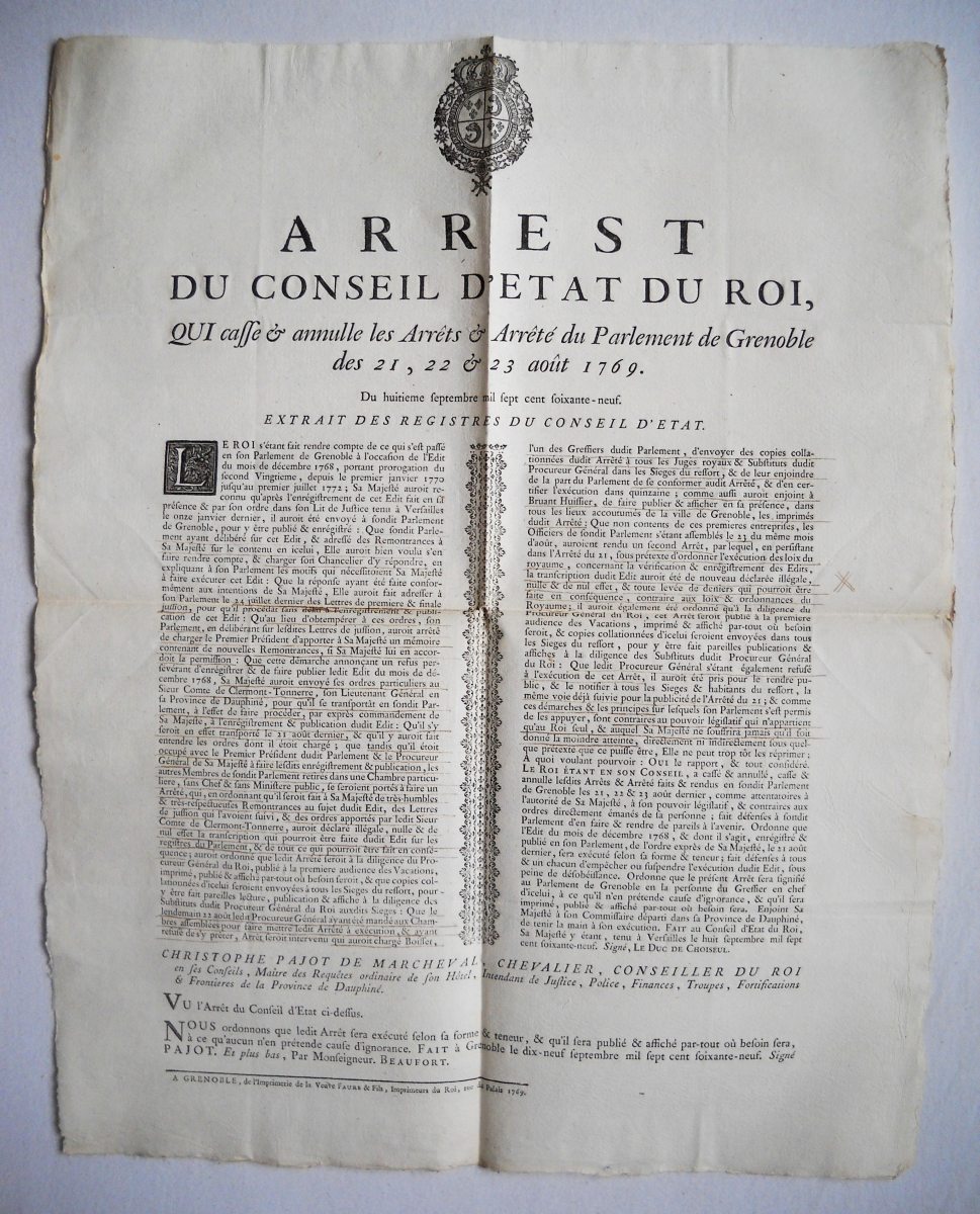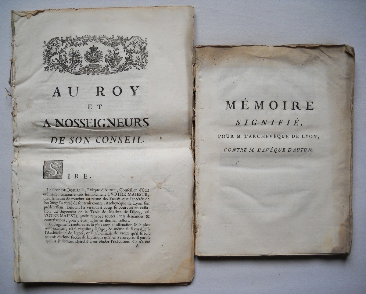 1689, 6 pp., in-8 - Edit du roy portant confirmation de la chambre des comptes de Dole. A Paris, chez Estienne Michallet, 1692, 14 pp., in-8 - Edit du roy portant creation de la chancellerie de Besançon. A Paris, chez Estienne Michallet, 1692, 8 pp., in-8 - Edit du roy qui regle les sommes qui seront payées par les états de Bourgogne pour estre confirmez dans leurs privileges. A Paris, chez Louis Denis de la Tour, 1727, 7 pp., in-4 - Lettres patentes sur arrest portant reglement sur l'administration des affaires municipales de Grenoble. A Grenoble, chez André Giroud, 1752, 18 pp., in-8 - Mémoire signifié pour M. l'archevêque de Lyon contre M. l'évêque d'Autun. P.G. Le Mercier, 1766, 149-10 et XIV pp. de table des sommaires, in-4 ; suivi de Au roy et à nosseigneurs de son conseil. Veuve d'Houry, 1766, 28-16 pp., in-fol. - Arrest du conseil d'état du roi qui casse & annulle les arrêts & arrêté du parlement de Grenoble des 21, 22 & 23 août 1769, 8 septembre 1769. A Grenoble, veuve Faure & fils, 1769, 41 x 52 cm - Arrêt du conseil d'état du roi concernant les coiffeurs de femmes de la ville de Lyon, 12 juin 1780. A Paris, de l'imprimerie royale, 1780, 4 pp., in-4 - Arrest du conseil d'estat qui casse & annulle une délibération des élus généraux des Etats de Bourgogne, 2 août 1776. A Paris, de l'imprimerie royale, 1776, 2 pp., in-4 - Edit du roi et lettres de jussion sur icelui concernant la réunion de la principauté de Dombes au pays de Bresse, 6 mars 1782. A Paris, de l'imprimerie royale, 1782, 6 pp., in-4 - Recueil des titres concernant les droits et privilèges de la ville de Strasbourg, relativement à son commerce. A Strasbourg, Levrault, 1783, 81 pp., in-4 - Lettres patentes du roi qui (