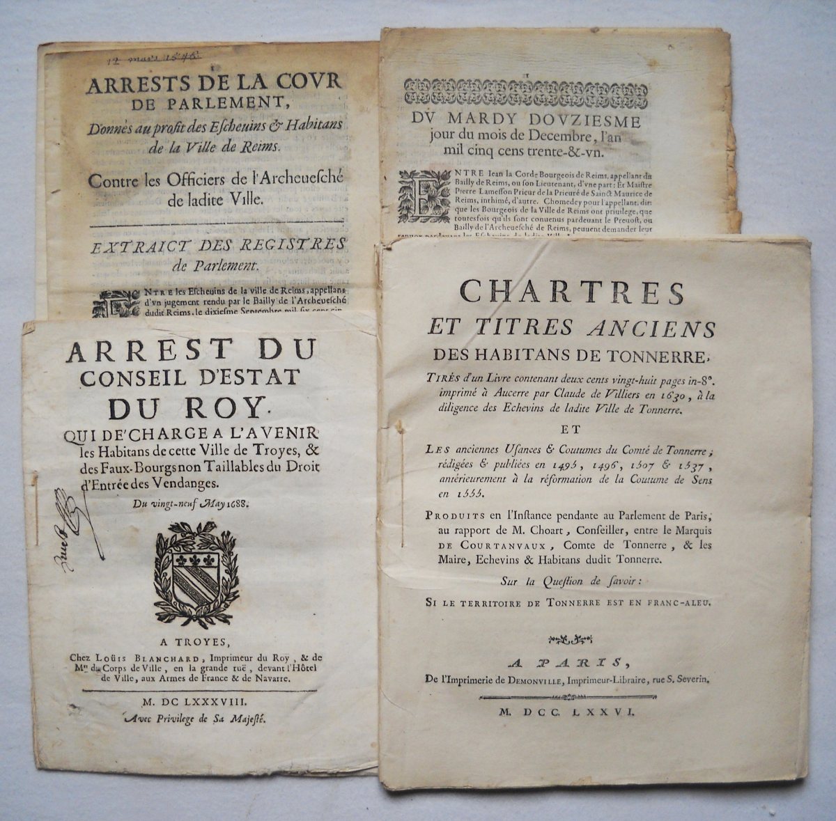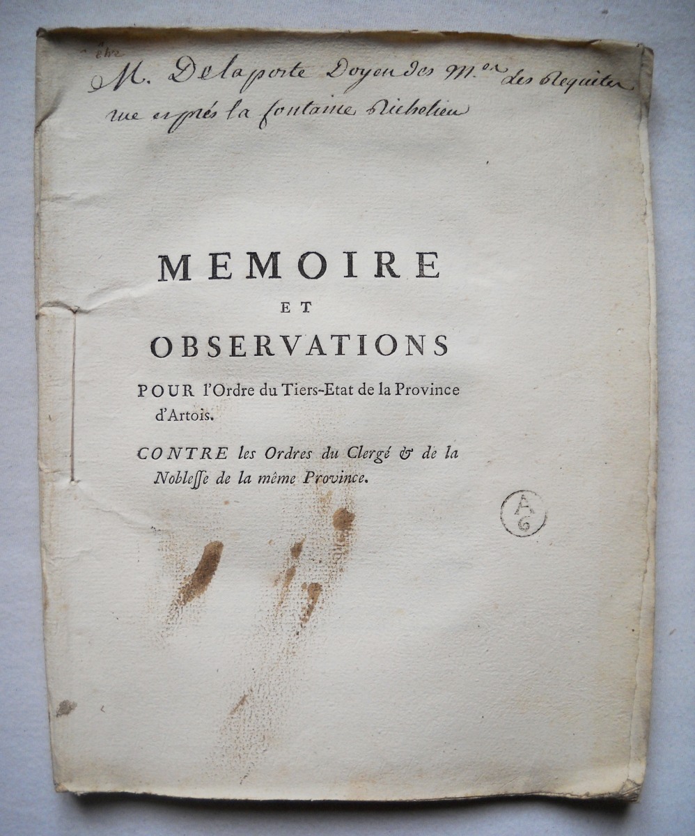 29 juin 1700. 7 pp., in-4 - Mémoire et observations pour l'ordre du Tiers-Etat de la province d'Artois contre les ordres du clergé & de la noblesse de la même province. A.L. Regnard, 1763, 105 pp., in-4 - Chartes et titres anciens des habitans de Tonnerre (