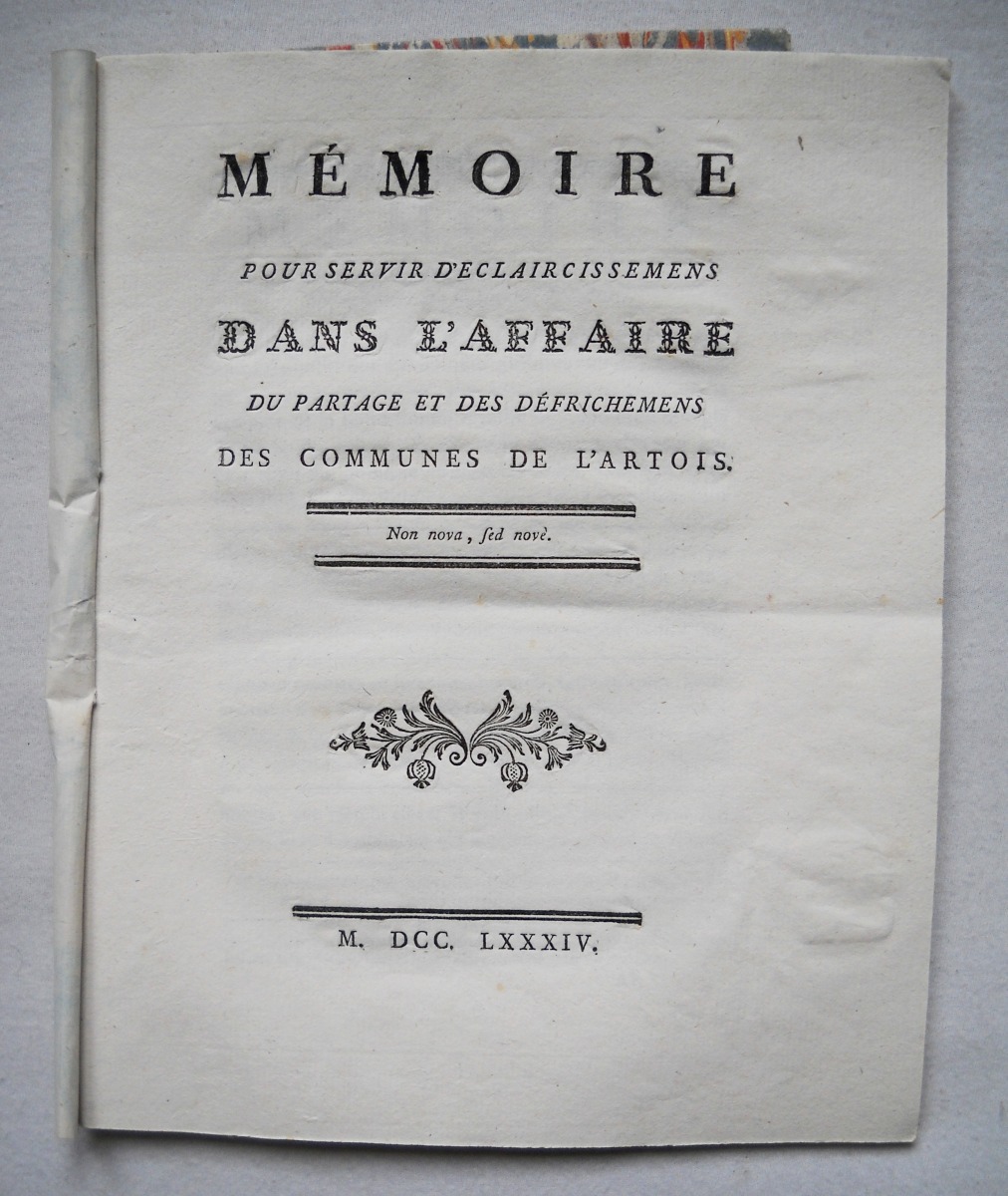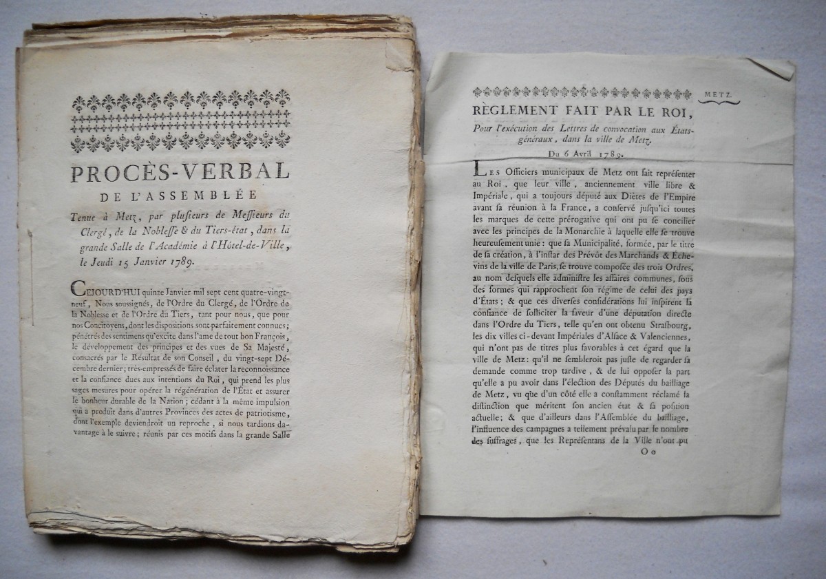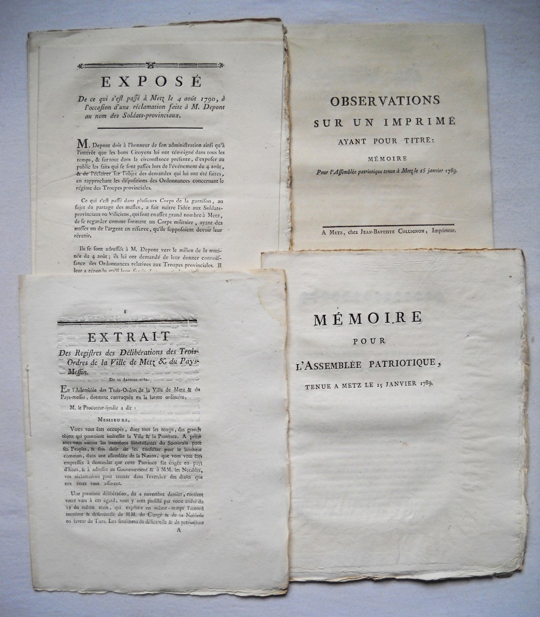 A Paris, chez Knapen & fils, 1784, 24 pp., in-4 - Mémoire pour servir d'éclaircissemens dans l'affaire du partage et des défrichemens des communes de l'Artois. 1784, 43 pp., in-4 - Arrêt du conseil d'état du roi concernant les états de Flandres, 2 mars 1789. A Paris, de l'imprimerie royale, 1789, 4 pp., in-4 - Règlement fait par le roi pour l'exécution des lettres de convocation aux Etats-Généraux dans la ville de Metz, 6 avril 1789. A Paris, de l'imprimerie royale, 1789, 2 pp., in-4 - Mémoire pour l'assemblée patriotique tenue à Metz le 15 janvier 1789. Ve Antoine et Fils, 33 pp., in-4 - Procès-verbal de l'assemblée tenue à Metz, par plusieurs messieurs du clergé, de la noblesse & du Tiers-Etat, dans la grande salle de l'académie de l'Hôtel de Ville, le jeudi 15 janvier 1789. 78 pp., in-4 - Procès-verbal du 25 janvier 1789. 64 pp., in-4 - Observations sur un imprimé ayant pour titre: mémoire pour l'assemblée patriotique tenue à Metz le 15 janvier 1789. A Metz, chez Jean-Baptiste Collignon, 24-(4) pp., in-4 - Exposé de ce qui s'est passé à Metz le 4 août 1790, à l'occasion d'une réclamation faite à M. Depont au nom des soldats-provinciaux. A Metz, chez la veuve Antoine & fils, 11 pp., in-4 - etc.