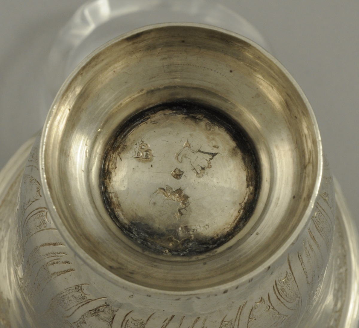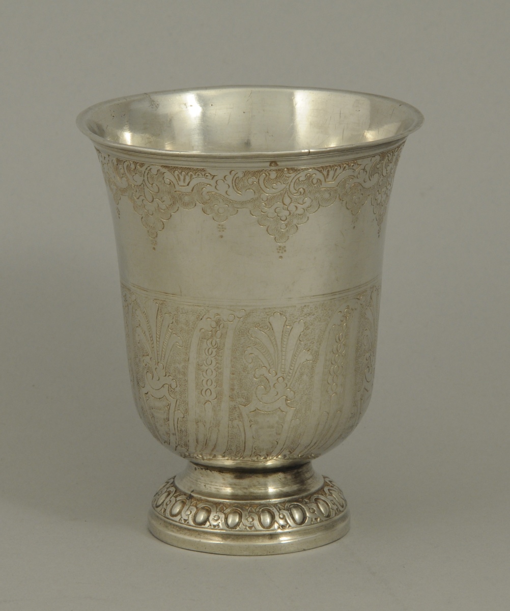 TIMBALE dite TULIPE en argent, le piédouche godronné, les flancs richement gravé de feuillages, rinceaux, godrons et listels. Le piédouche gravé "A CHIQUET".