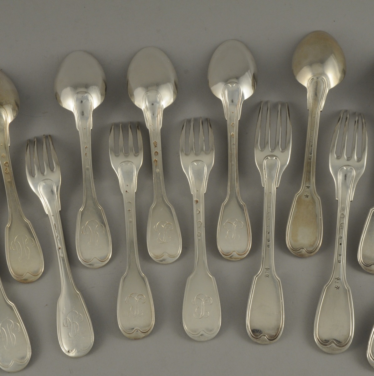 PARIS. Série de 12 COUVERTS en argent, modèle à filet-contour.