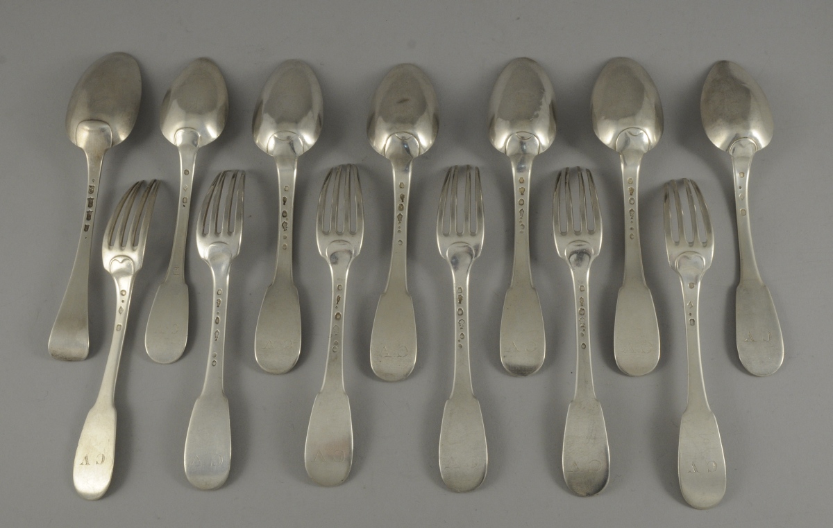 - COUVERT et FOURCHETTE DE TABLE. Modèle uniplat. Poinçon Vieillard, 1819-1838. Maître-Orfèvre: Jean-François Oury, orfèvre-cuilleriste au 7, passage de la Réunion à Paris. Monogrammés "CV". Poids: 135 g.