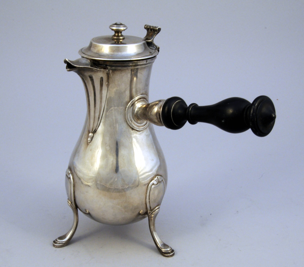 PARIS. CAFETIÈRE piriforme en argent. Bec verseur dit "canard" agrémenté de cannelures. Fretel en bouton mouluré, manche latéral en bois tourné et noirci. Repose sur trois pieds patins en applique à cartouche.