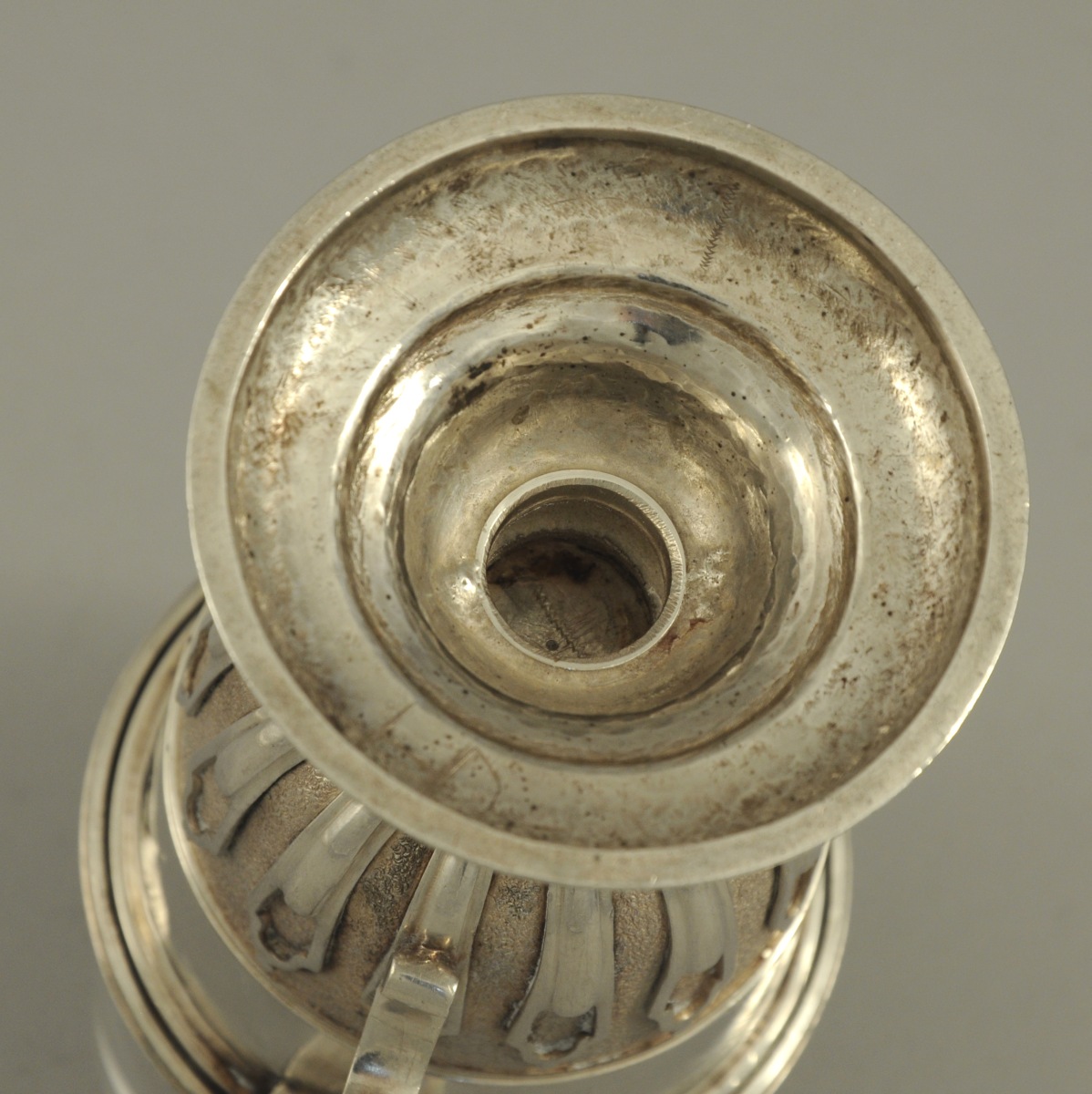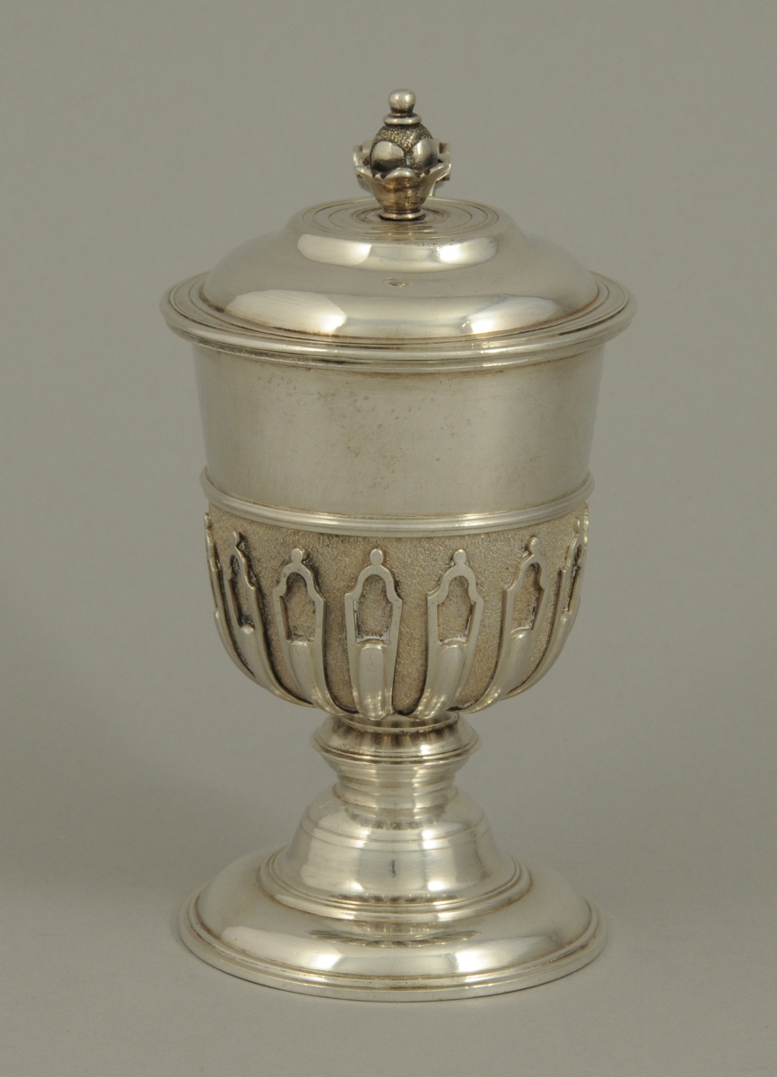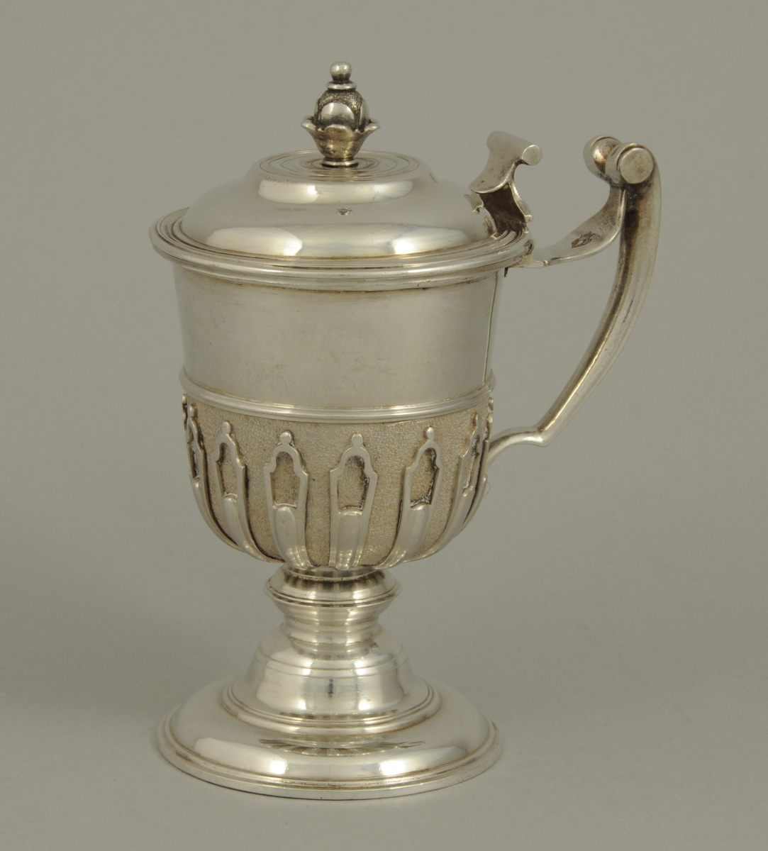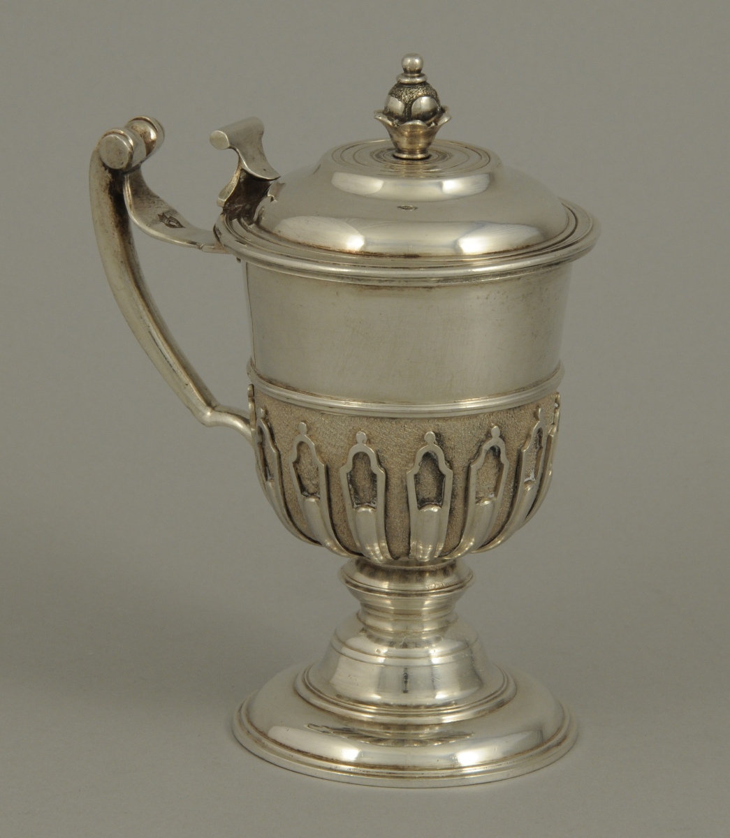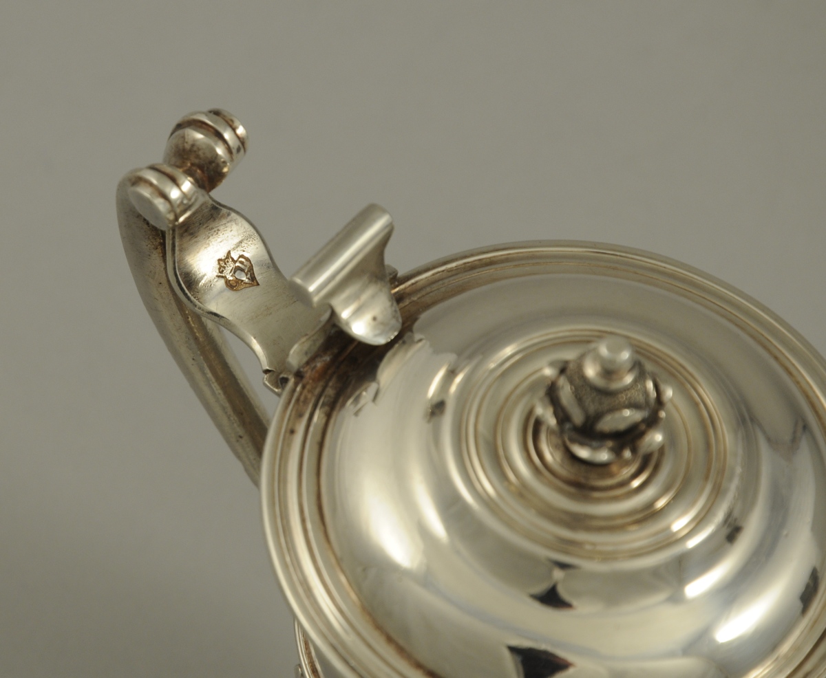 AVIGNON. MOUTARDIER couvert de forme balustre en argent orné à mi-corps d'appliques de lambrequins sur fond amati. Une prise en forme de graine (de moutarde?) éclatée surmonte le couvercle à doucine. Il repose sur un piedouche mouluré et une base ronde unie, gravée de filets.