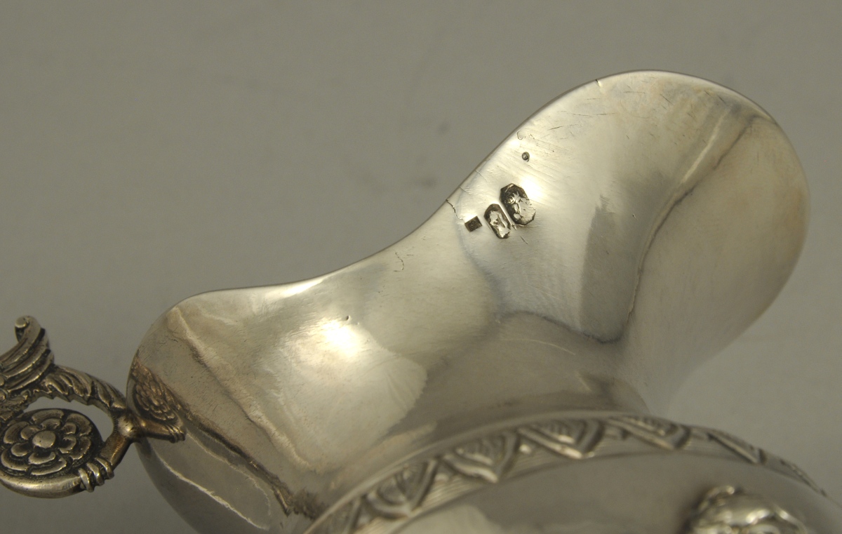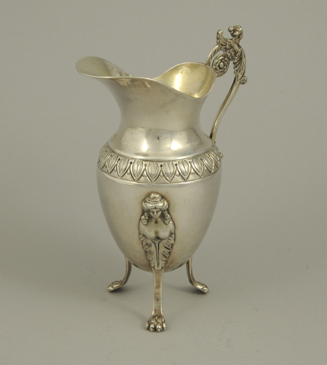 VERSEUSE en argent. Décor de frise de feuilles d'eau, anse en forme de sphynge. Elle repose sur une base tripode à buste féminin terminée par des pattes de lion.