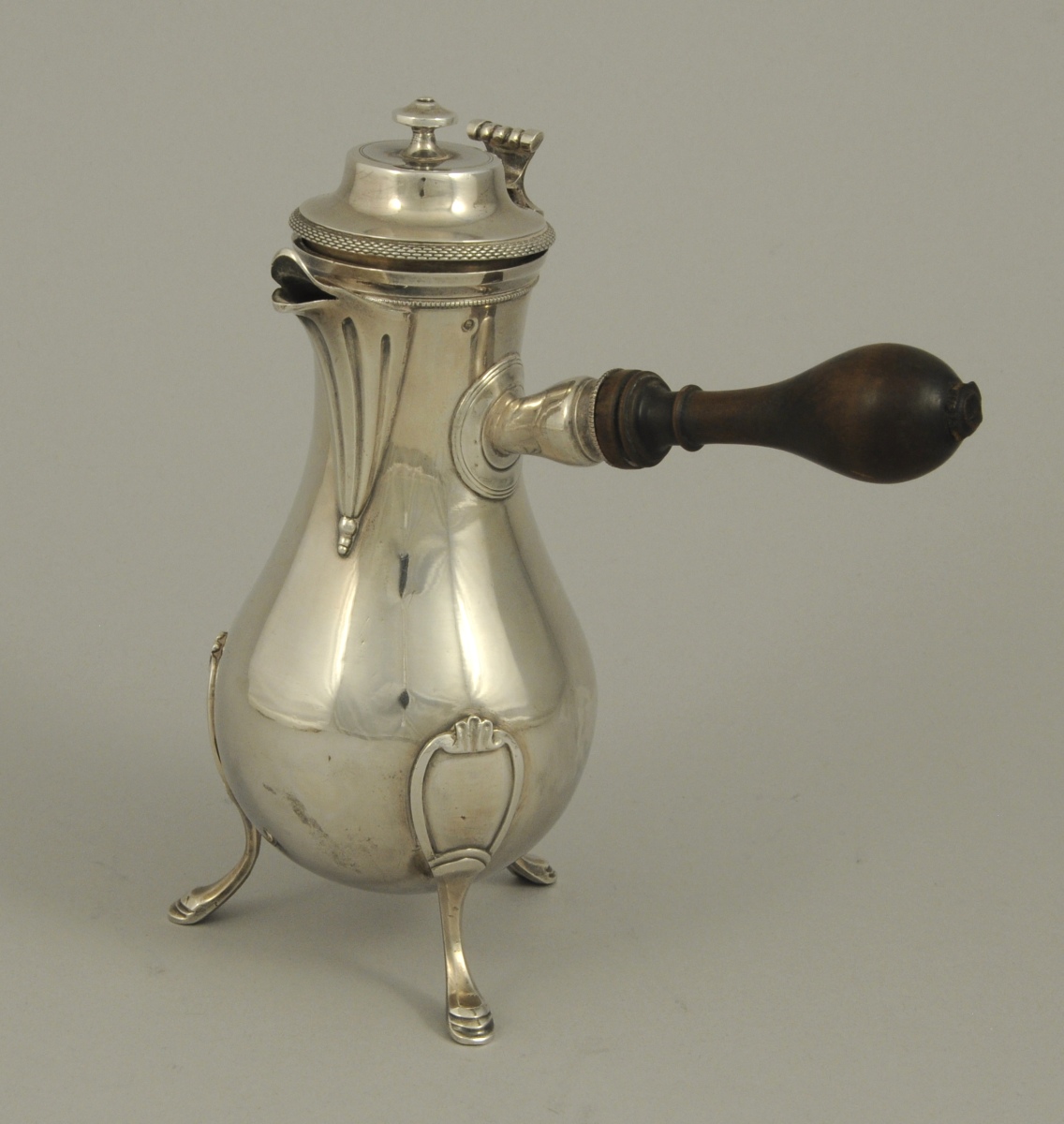VERSEUSE ÉGOÏSTE en argent de forme balustre. Couvercle à charnière et doucine. Bec cannelé, monogramme, piètement tripode, attaches des pieds en écusson à agrafe. Manche latéral en bois noirci tourné.