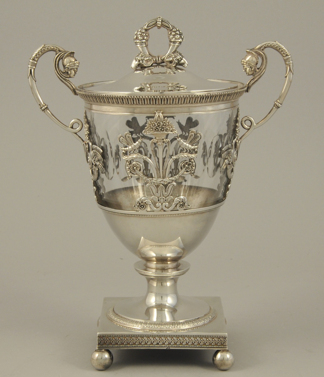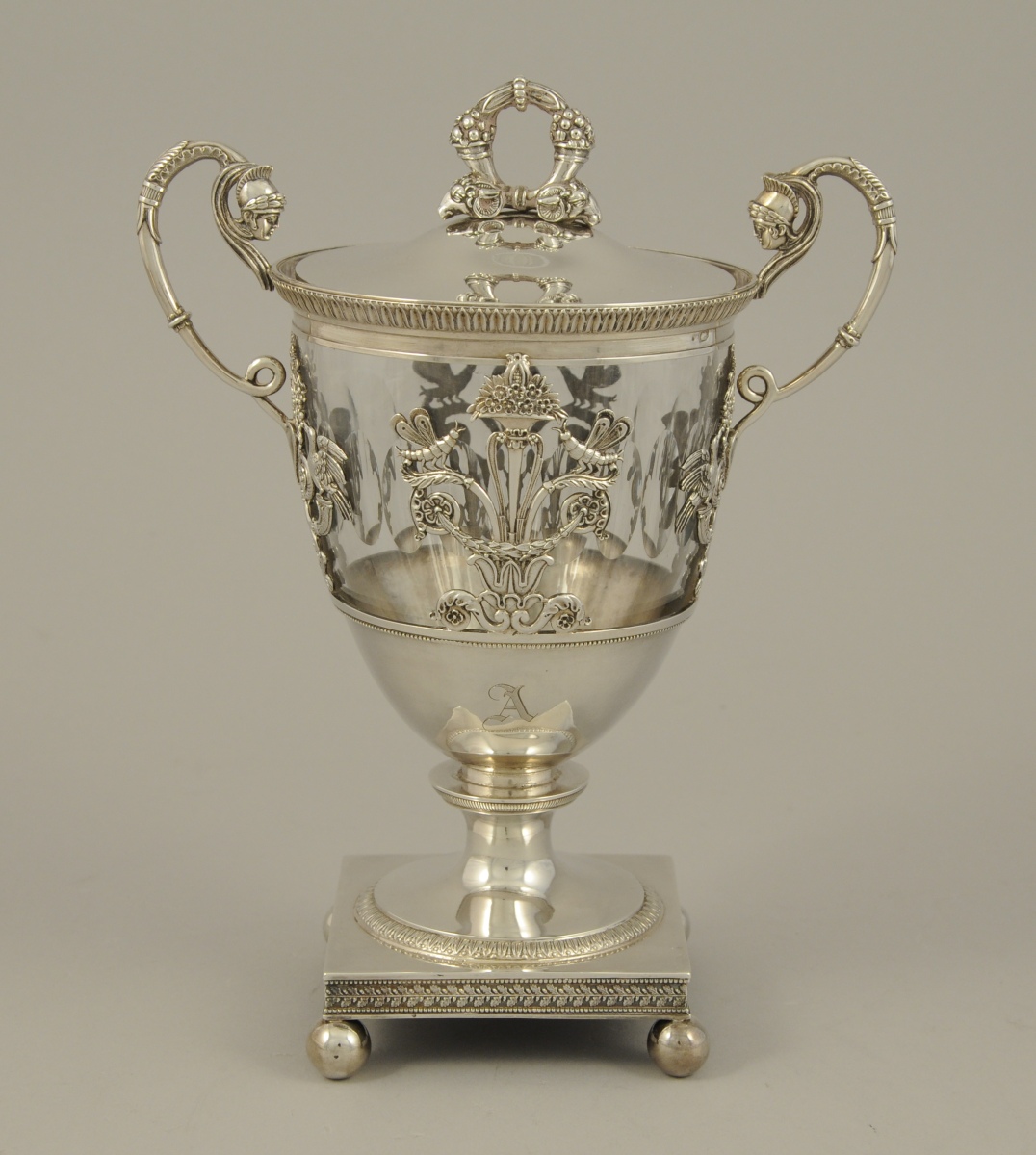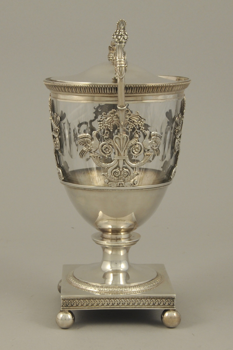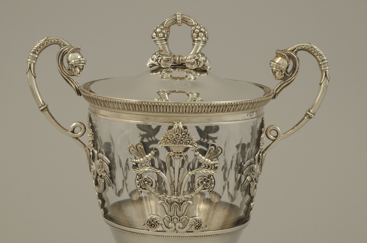 DRAGEOIR à monture en argent et réceptacle en cristal de forme balustre, anses à tête de soldats antiques et prise à cornes d'abondance et têtes de bélier. Corps ajouré à motifs de fleurs, libellules, oiseaux et rinceaux. Piédouche orné de feuilles d'eau et frise de feuilles de chêne. Il repose sur quatre pieds boule.