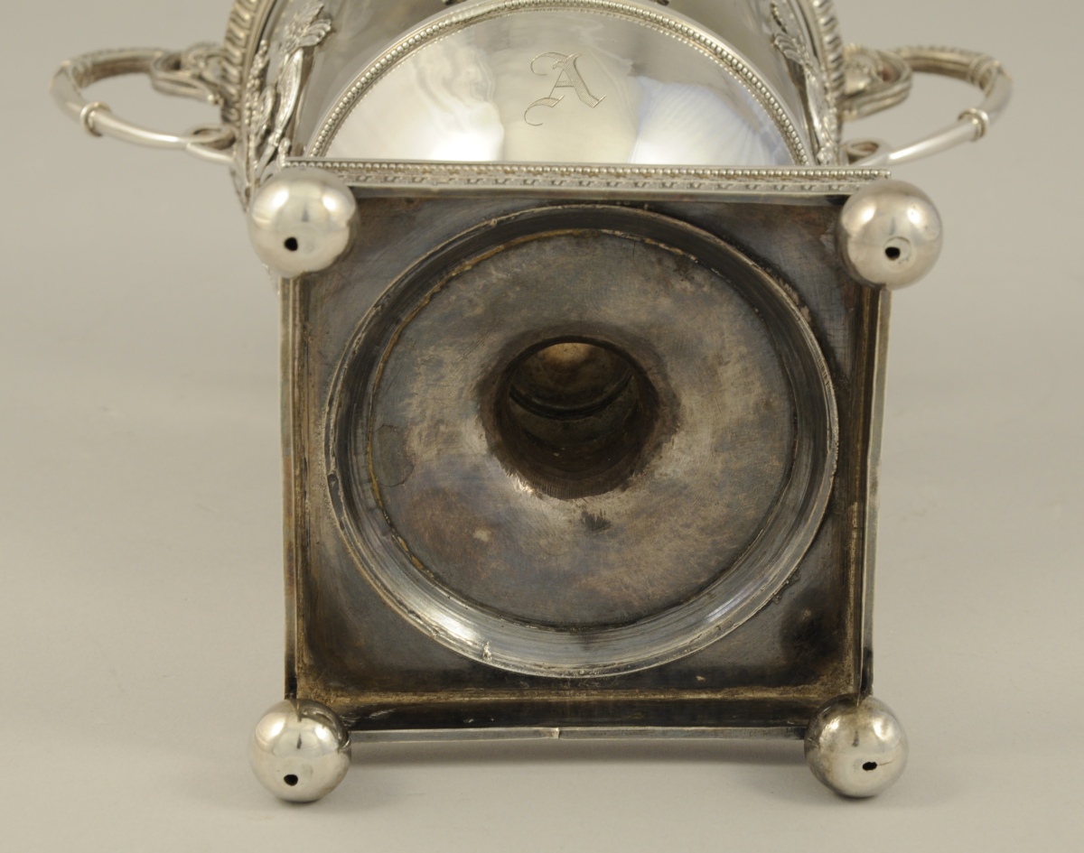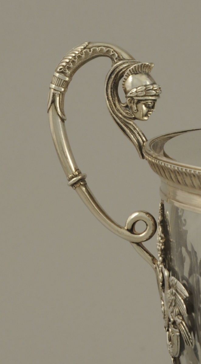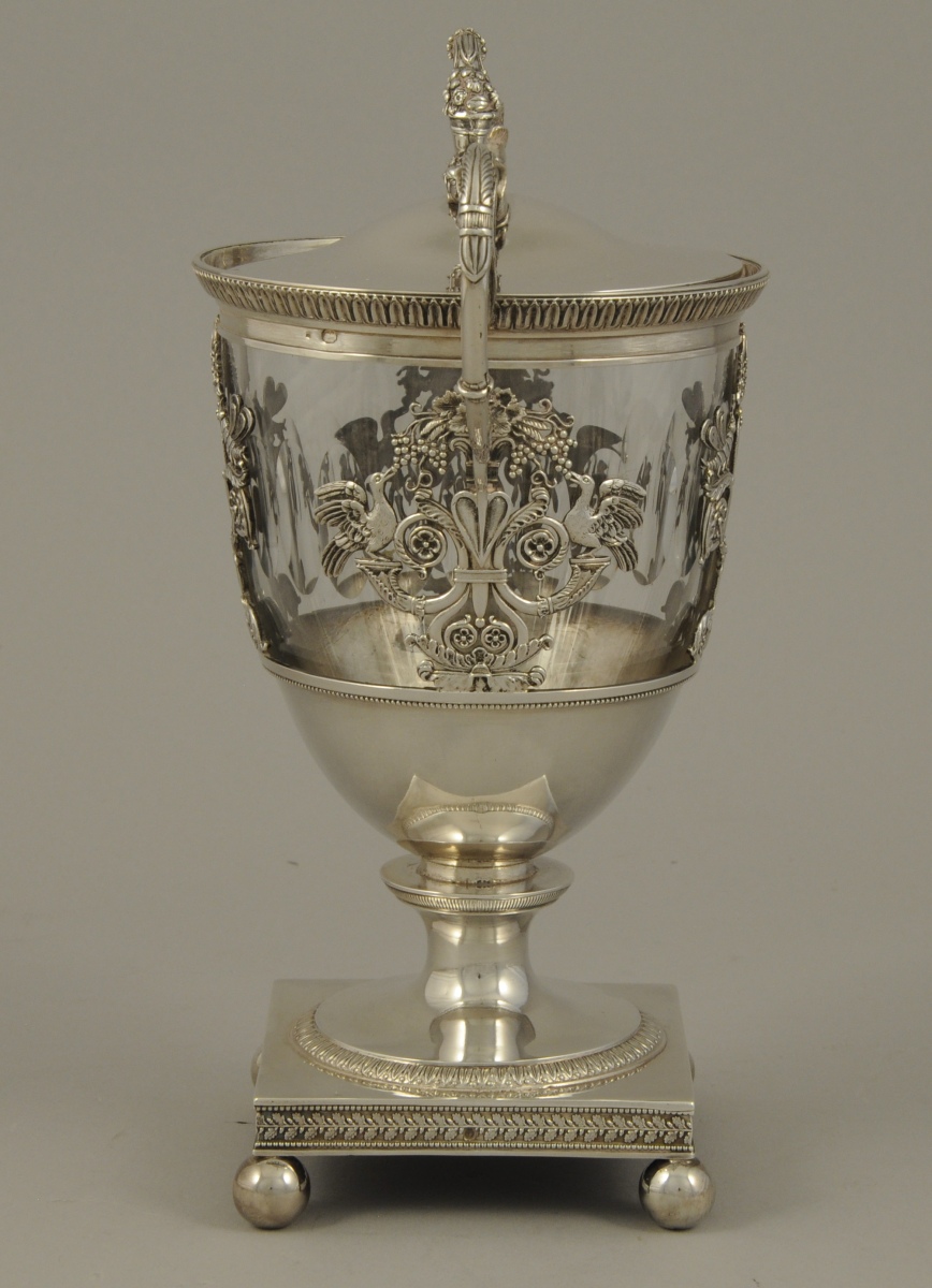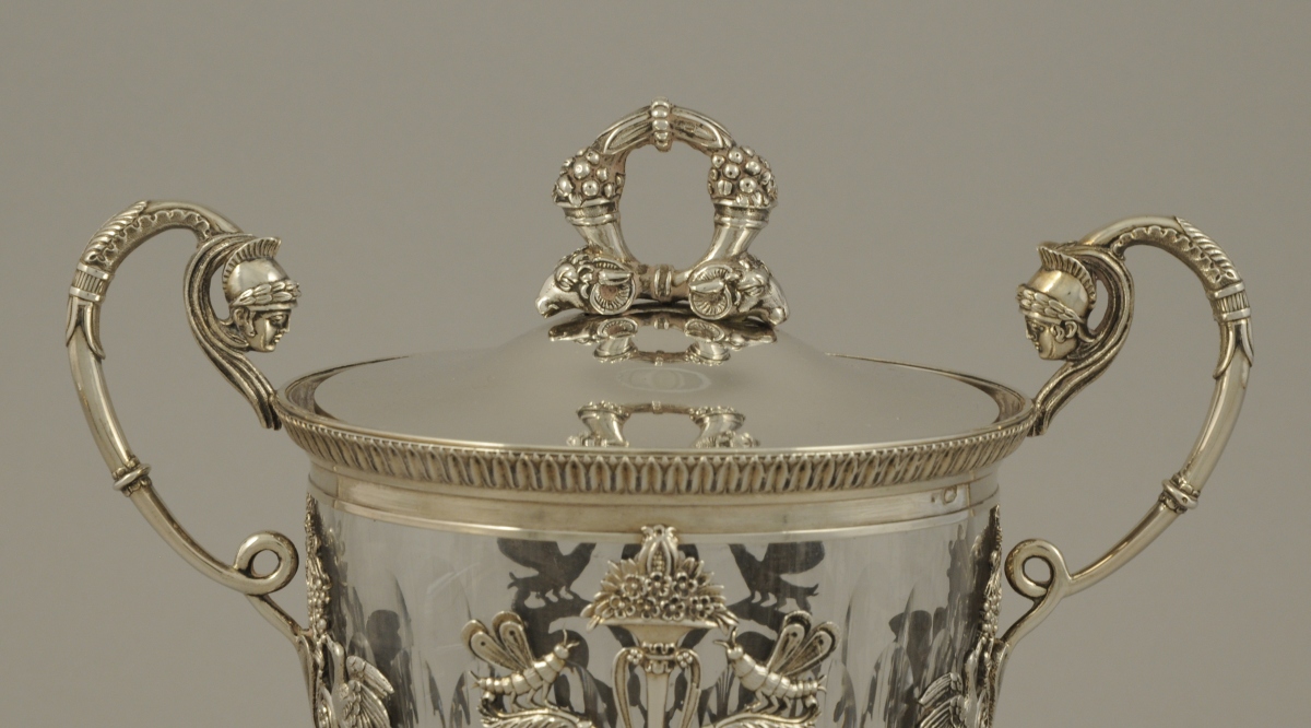 DRAGEOIR à monture en argent et réceptacle en cristal de forme balustre, anses à tête de soldats antiques et prise à cornes d'abondance et têtes de bélier. Corps ajouré à motifs de fleurs, libellules, oiseaux et rinceaux. Piédouche orné de feuilles d'eau et frise de feuilles de chêne. Il repose sur quatre pieds boule.