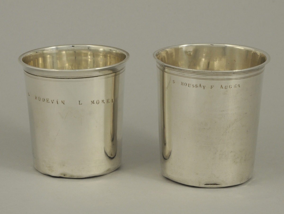 - La première monogrammée "BH", numérotée 35 et marquée "S HOUSSAY F AUGER". Poinçon Vieillard. Province, 1819-1838. Maître-Orfèvre: J. Carlier. Haut. 7,5, Diam. 7 cm. Poids: 80 g.