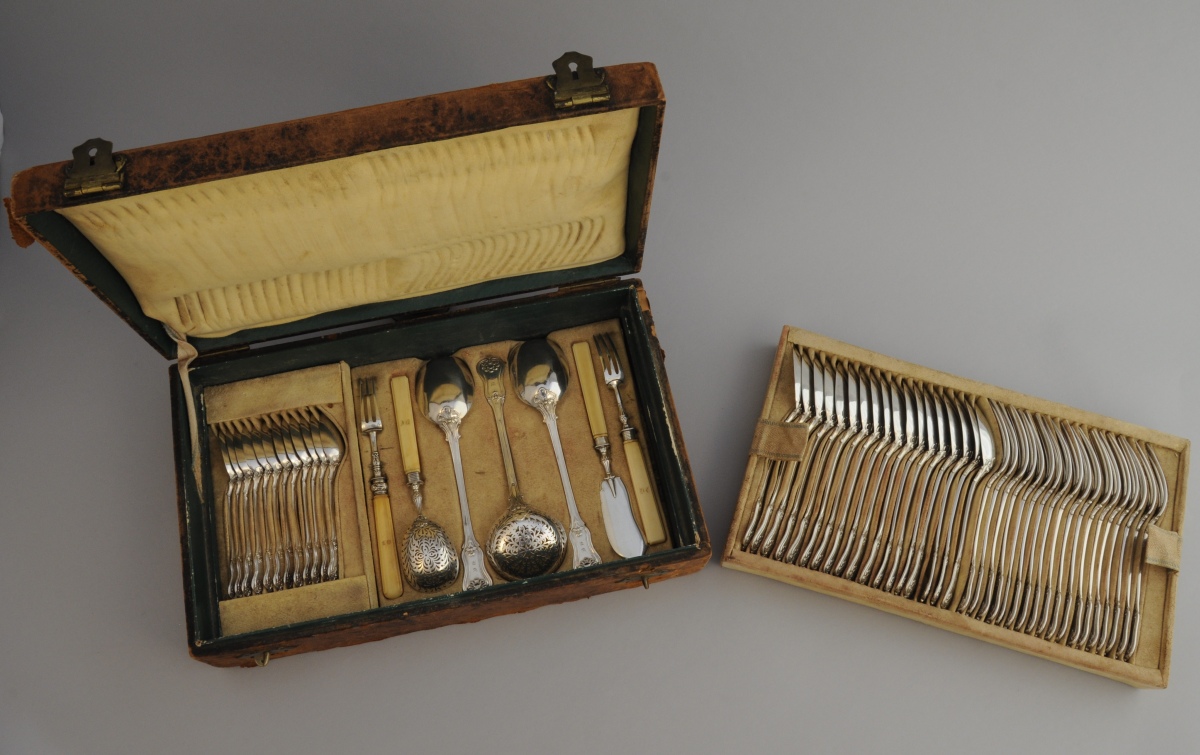 MÉNAGÈRE À ENTREMETS, 55 pièces, en argent. Modèle double filets, coquille en agraffe et feuillage composée de: 18 couverts, 12 petites cuillères et 7 pièces de service (2 cuillères à crème, une cuillère saupoudreuses, 2 fourchettes et une pelle à fruits confits et une cuillère à olives), dont quatre à manche en ivoire. Les manches monogrammés "D.E." Dans son écrin en cuir.