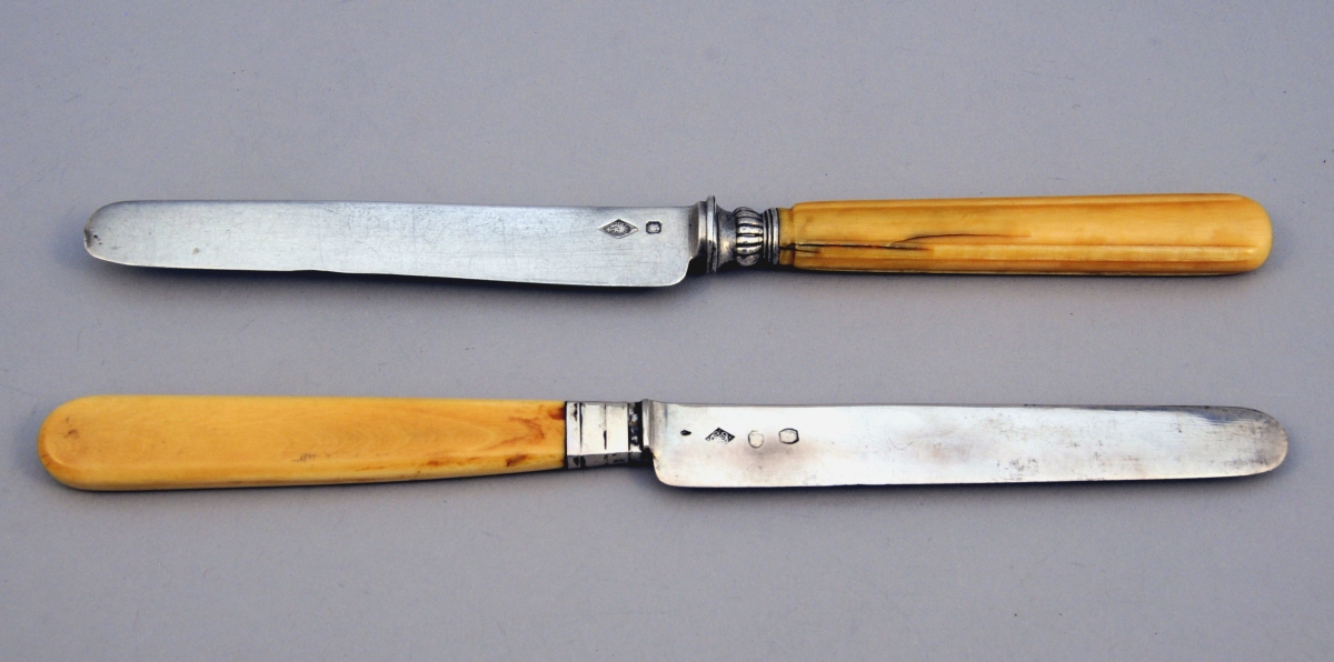Suite de 12 COUTEAUX À FRUITS. Lame en argent, manche en ivoire.