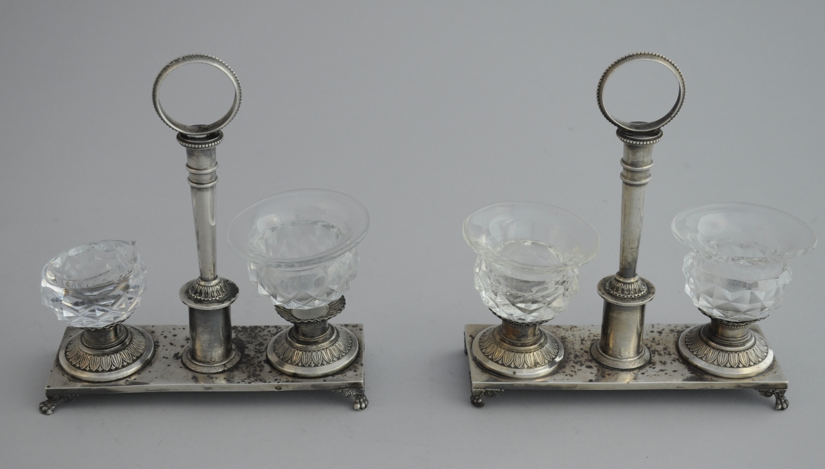 Paire de SALIÈRES DOUBLES en argent, terrasse reposant sur des pieds griffes, fût colonne se terminant par un anneau orné de palmettes.