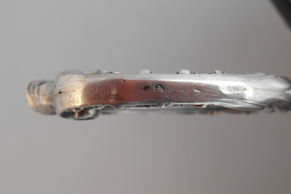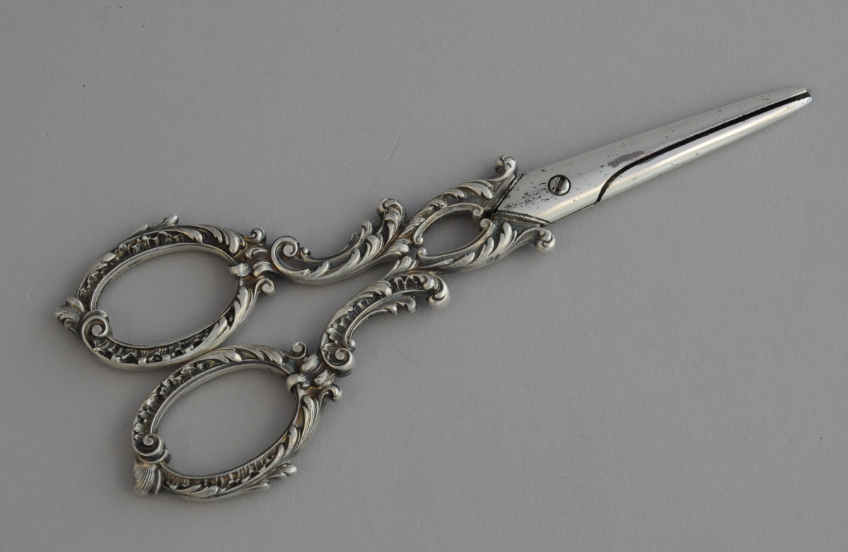 CISEAUX À RAISIN en argent. Riche ornementation de style Louis XV telle que agrafes et volutes feuillagées, enroulements et feuilles d'acanthe stylisées. Les lames en métal argenté.