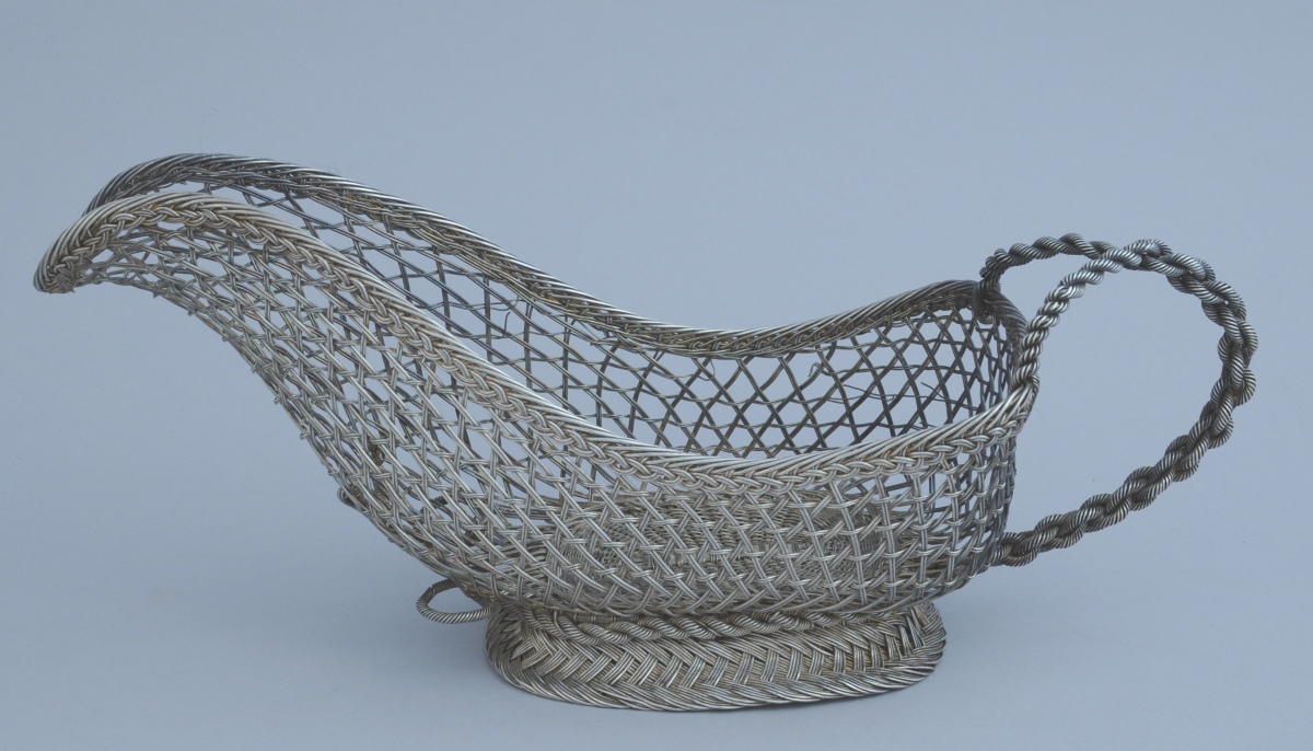 PRÉSENTOIR À BOUTEILLE de forme oblongue en vannerie de fils d'argent.