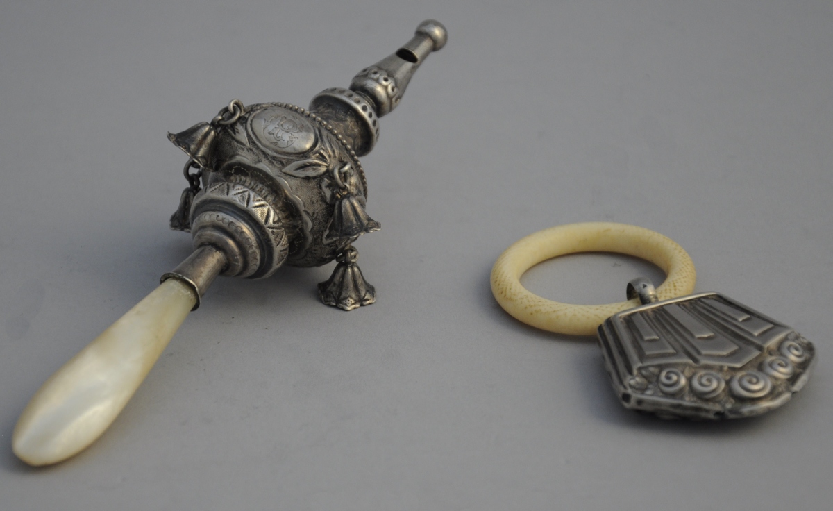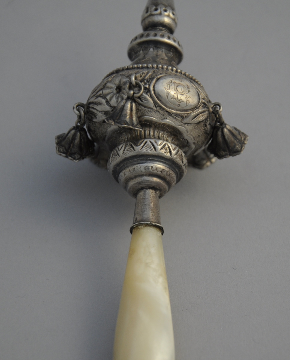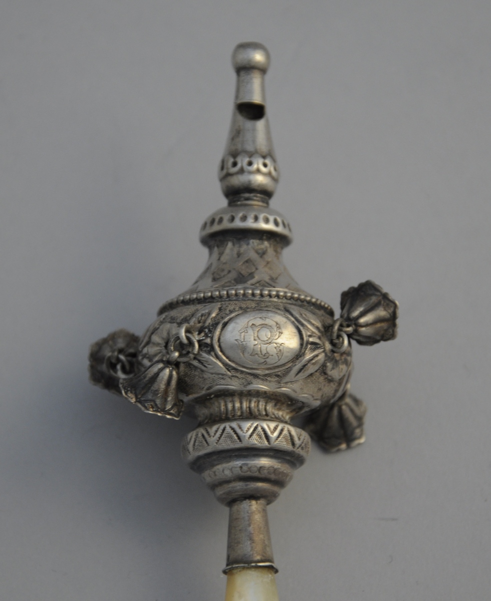 - Le premier à manche en nacre, sifflet et clochettes. Décor floral et frises géométriques. Monogrammé "PC" dans un cartouche. Poinçon à la hure de sanglier. XIXème. Long. 14,5 cm. Poids brut: 35 g. (manque une clochette, choc)