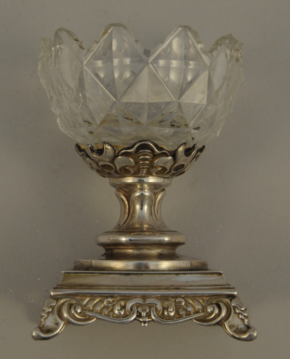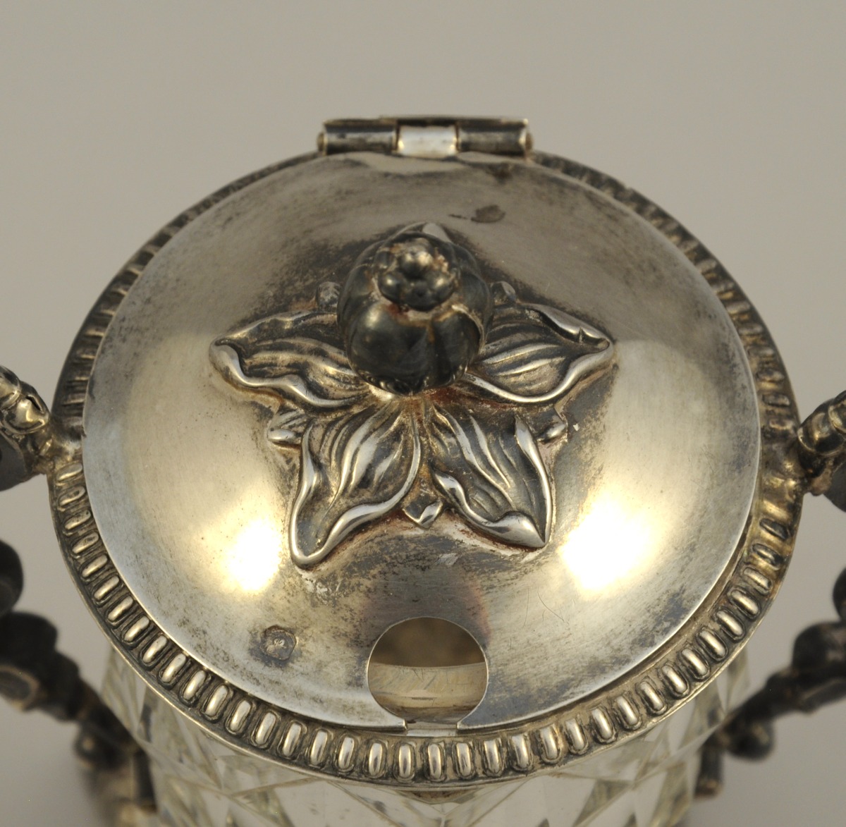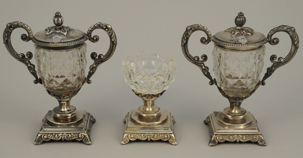 Paire de MOUTARDIERS et SALIÈRE d'un même modèle. Ils reposent sur un piédouche et une base quadripode de forme carrée ornée d'entrelacs feuillagés. Les anses figurent une agrafe feuillagée et le fretel adopte la forme d'une fleur. Godets en verre incolore taillés en pointes de diamant (accidents).