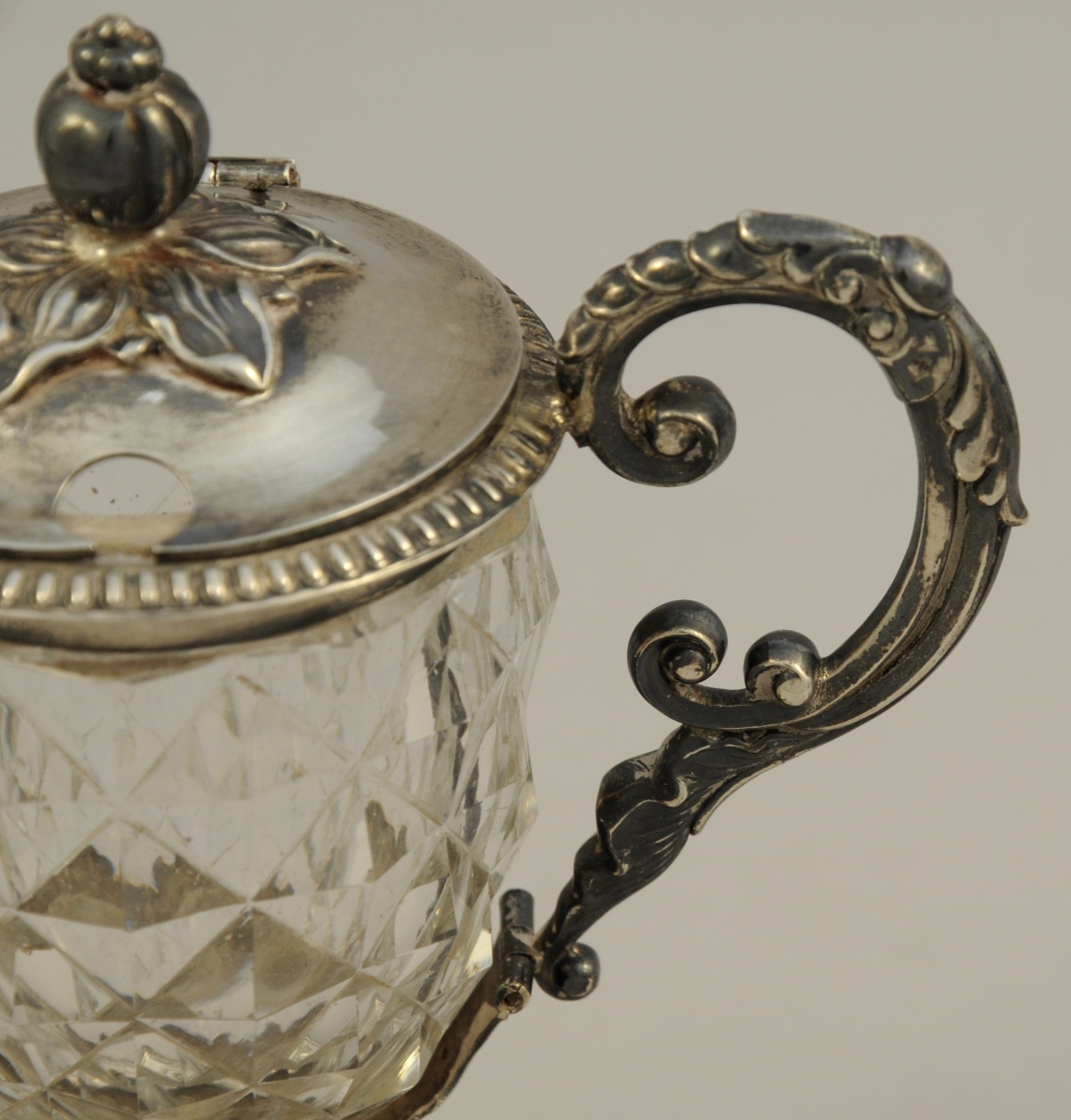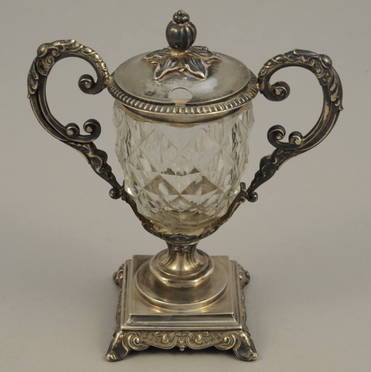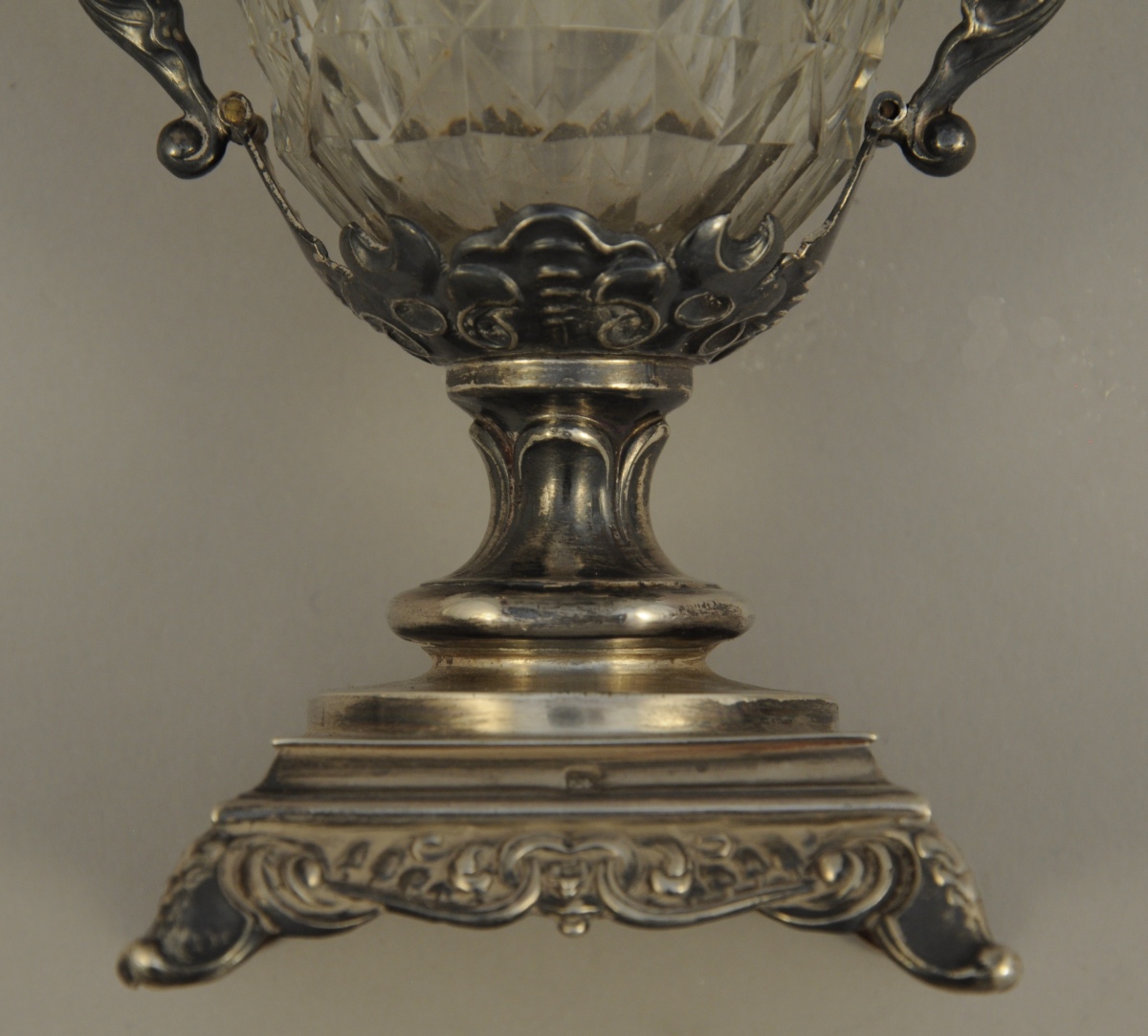 Paire de MOUTARDIERS et SALIÈRE d'un même modèle. Ils reposent sur un piédouche et une base quadripode de forme carrée ornée d'entrelacs feuillagés. Les anses figurent une agrafe feuillagée et le fretel adopte la forme d'une fleur. Godets en verre incolore taillés en pointes de diamant (accidents).