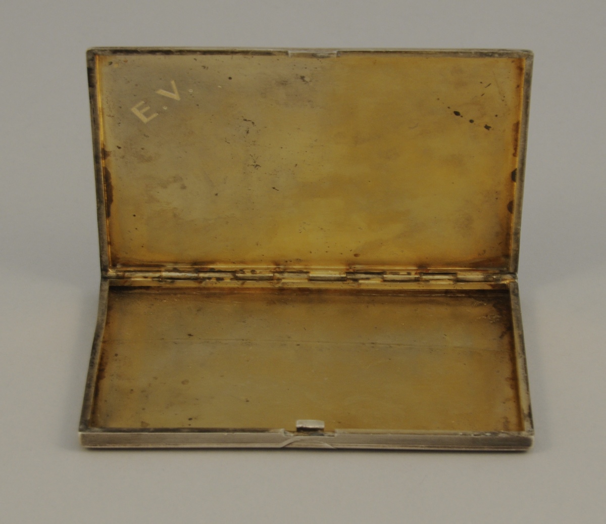 ÉTUI À CIGARETTES de forme rectangulaire en argent orné de stries. L'intérieur en vermeil monogrammé "E.V.".