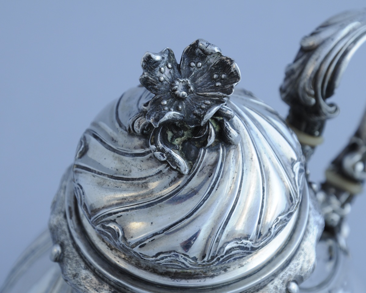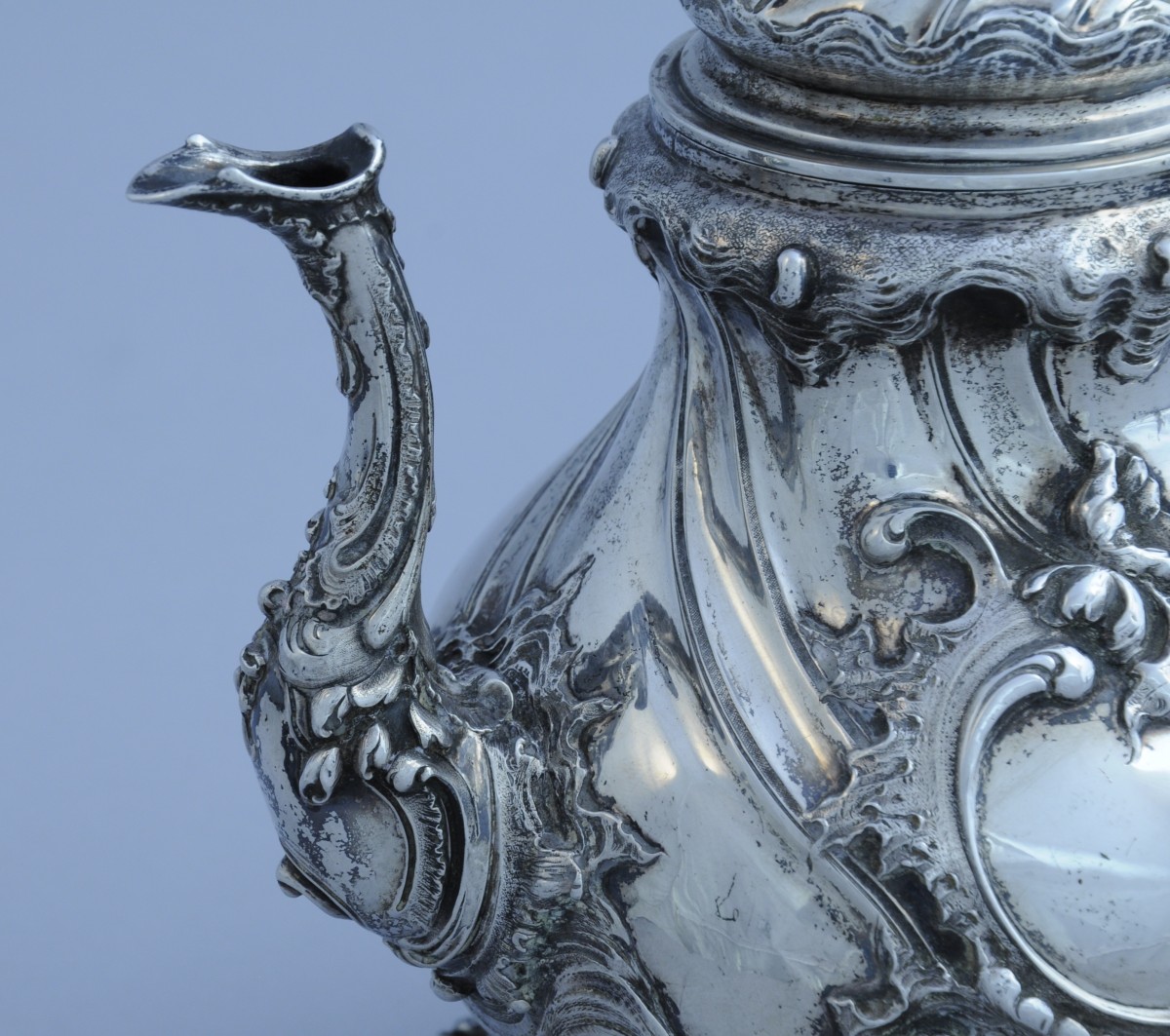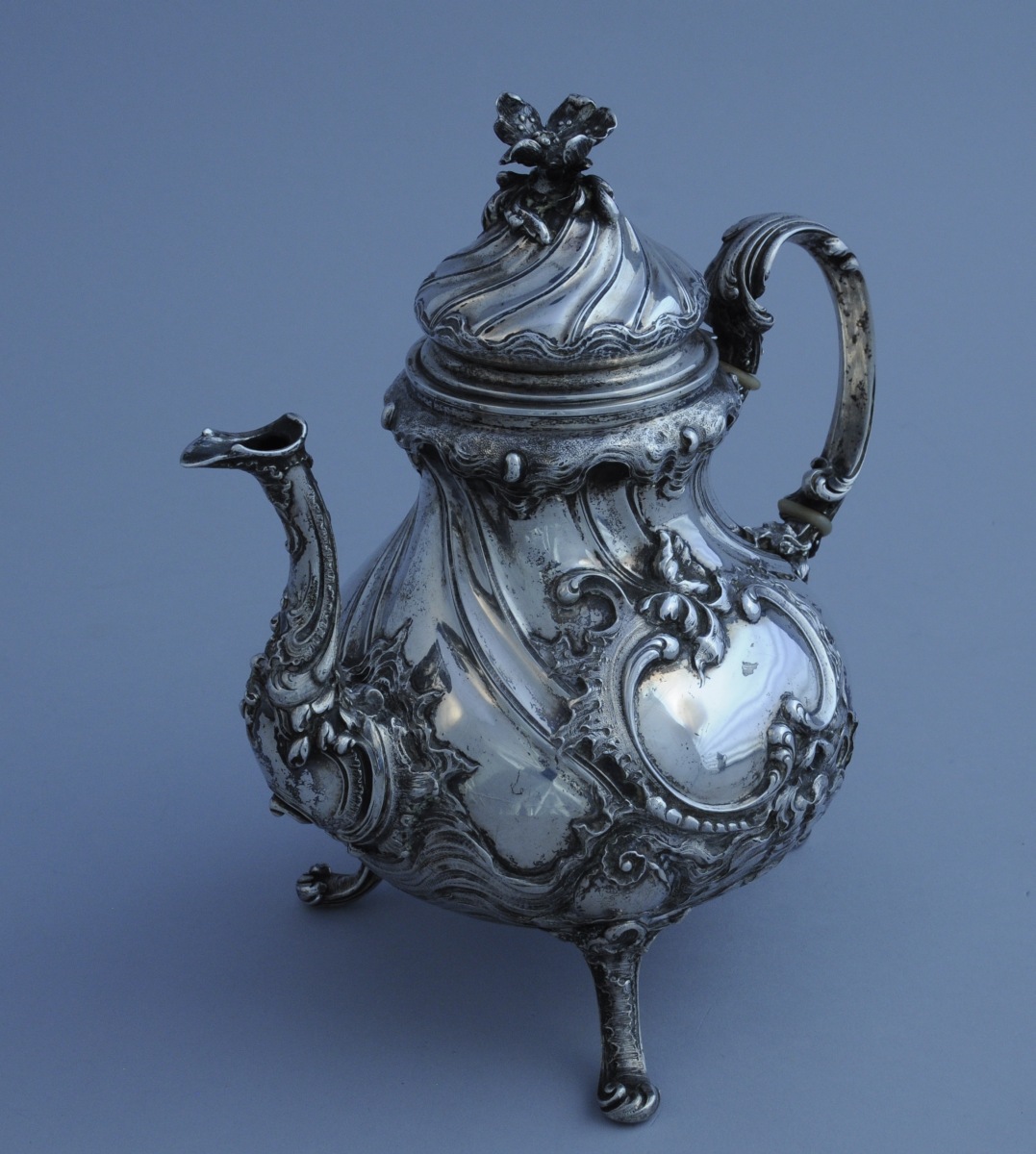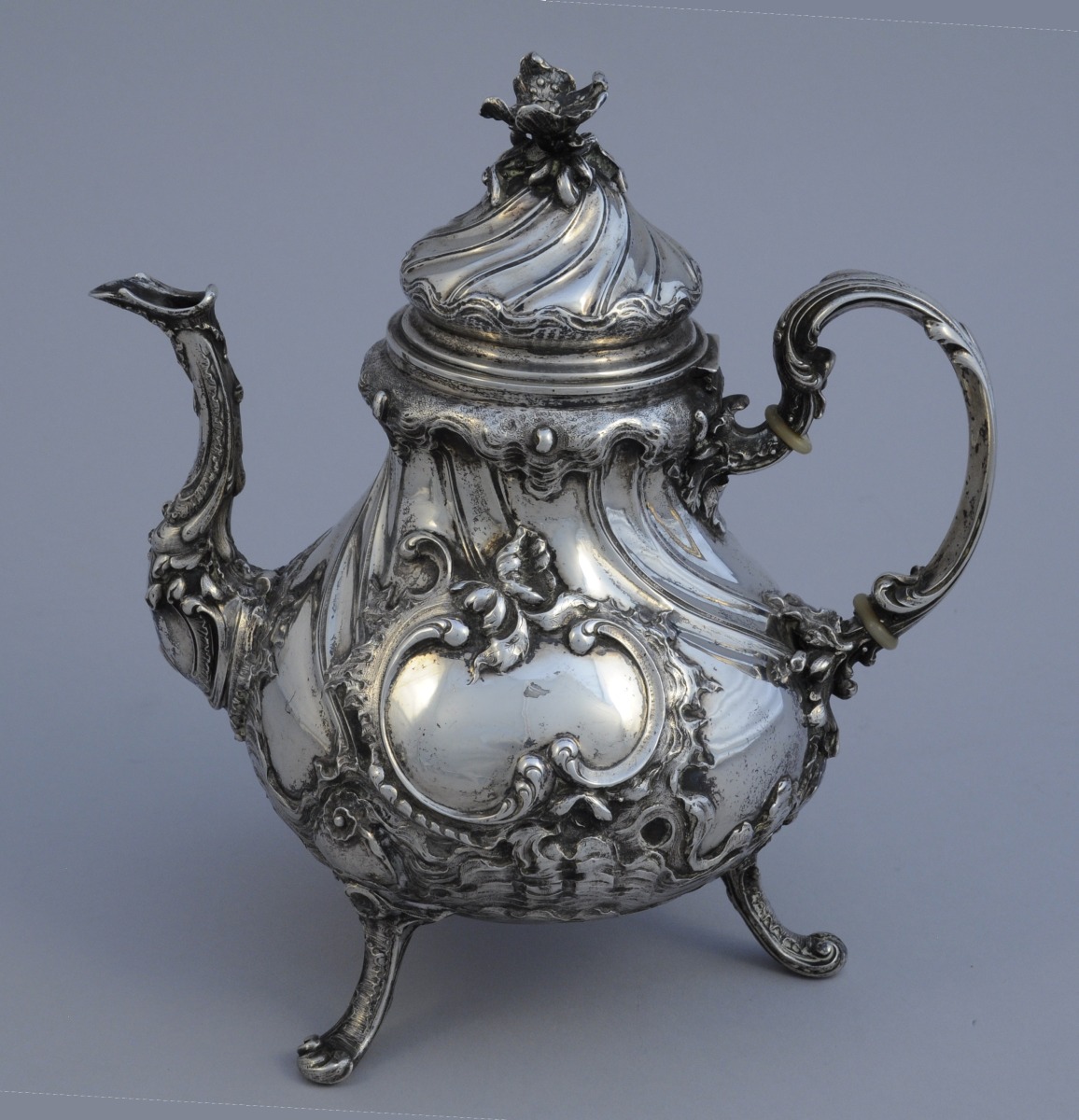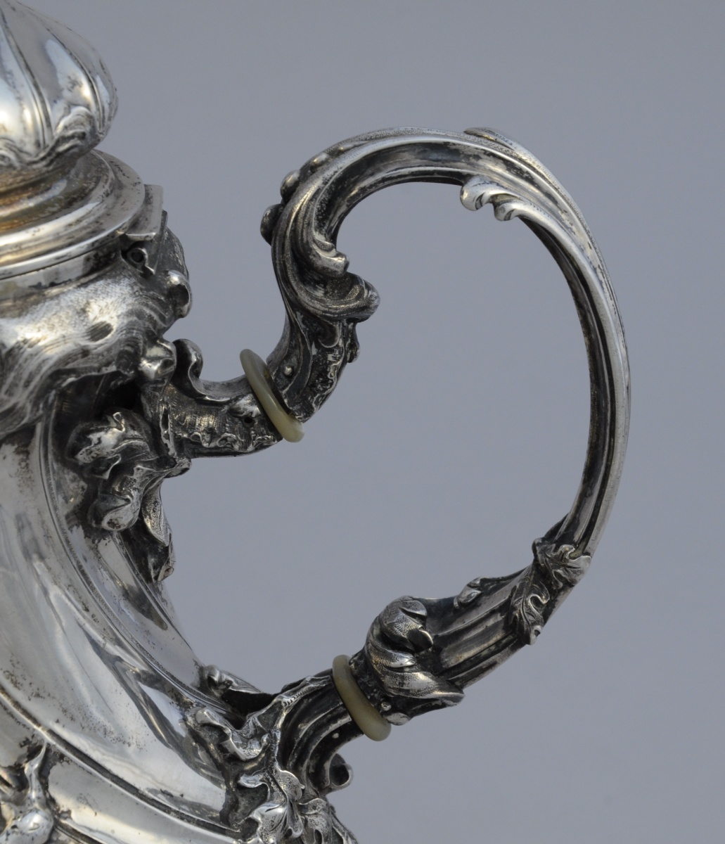 SERVICE À THÉ-CAFÉ, 4 pièces, en argent. Beau modèle à riche ornementation rocaille de style Louis XV telle que côtes torses, volutes, coquilles stylisées, agrafes et cartouches feuillagés. Il se compose d'une théière, d'une cafetière, d'un sucrier et d'une petite verseuse. Fretel figurant une fleur épanouie. Piètement tripode à volute. La théière et la cafetière baguées de corne blonde.