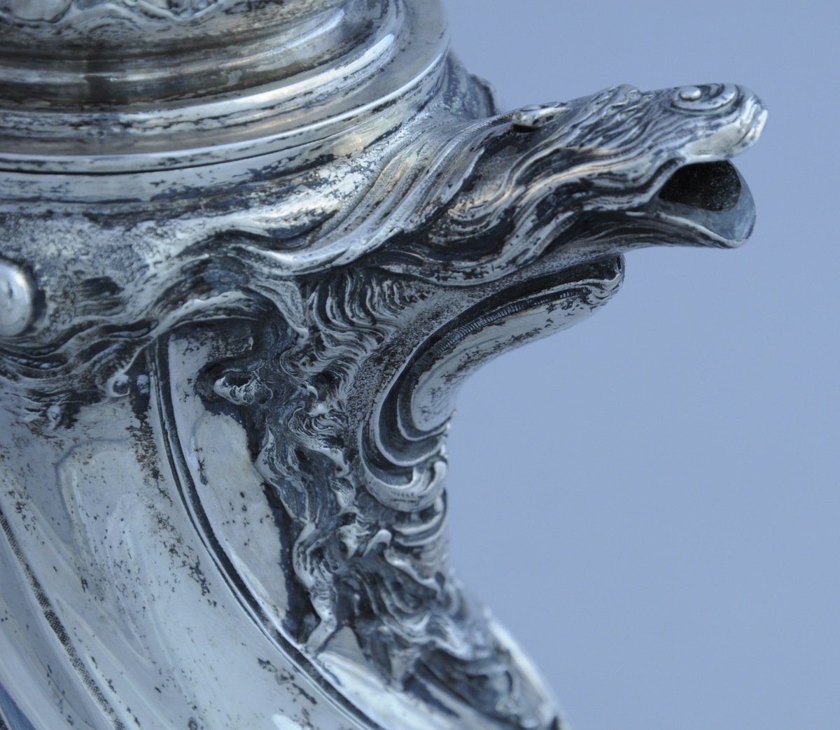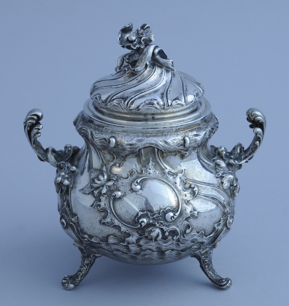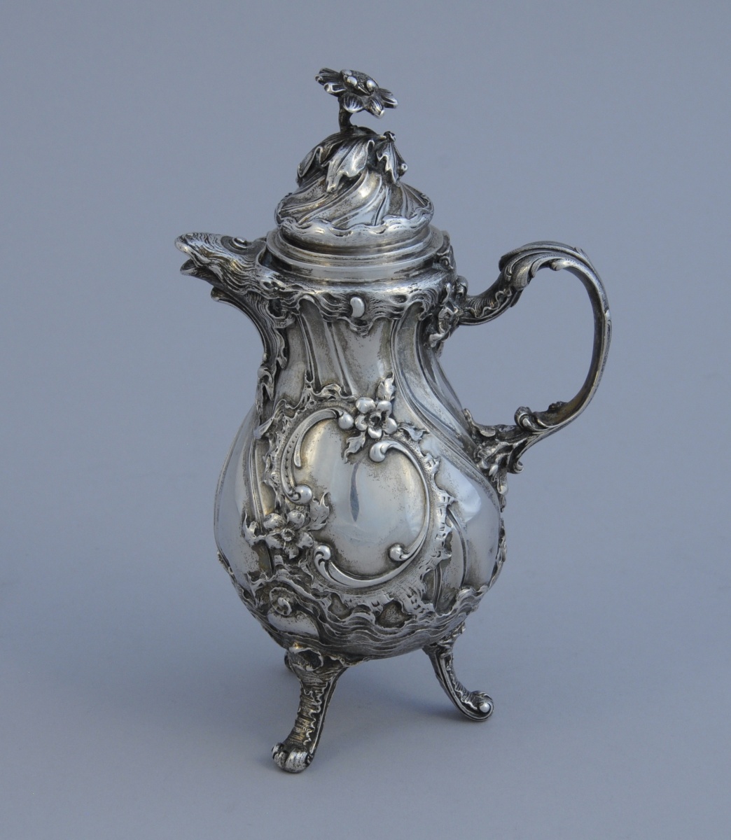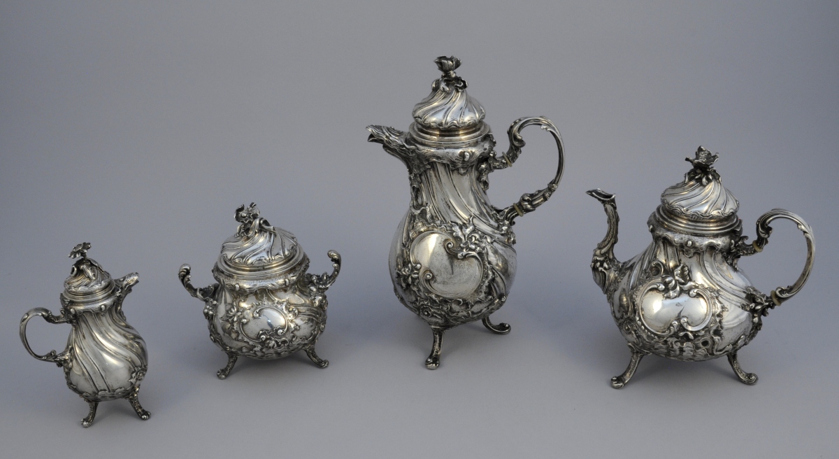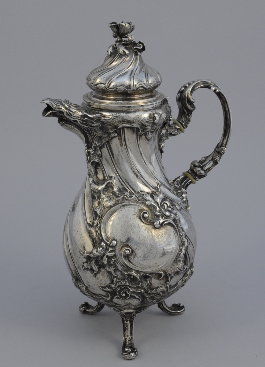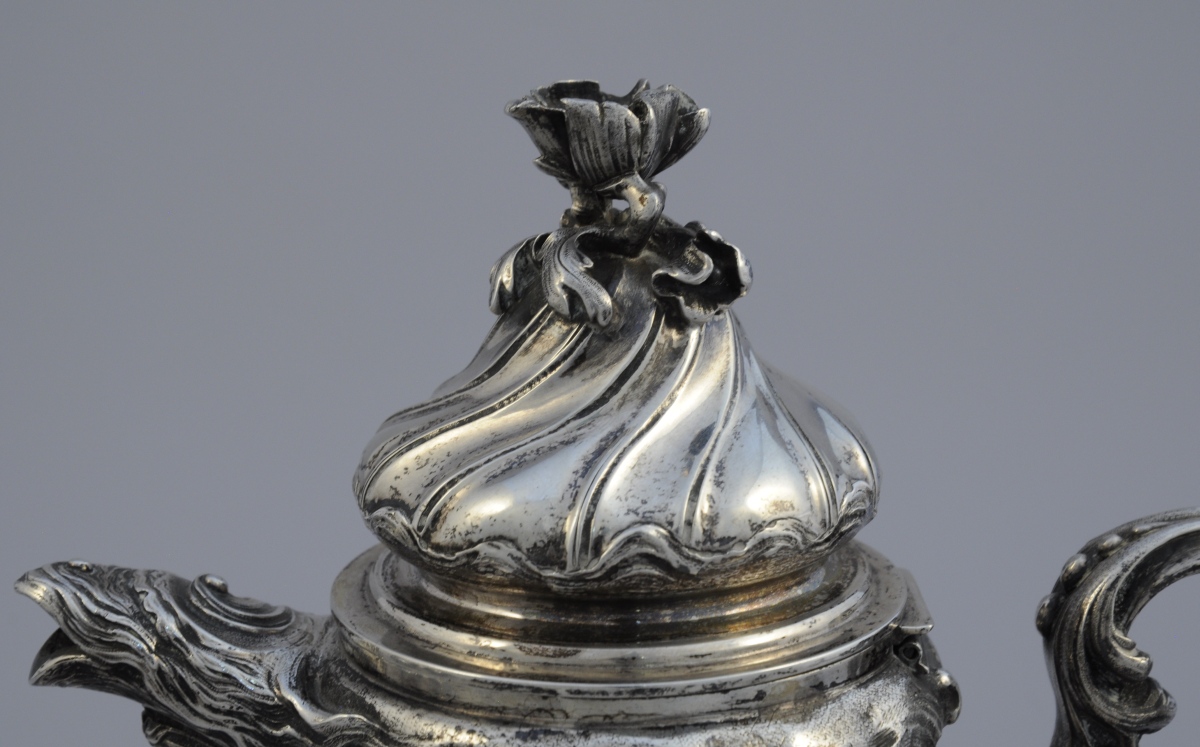 SERVICE À THÉ-CAFÉ, 4 pièces, en argent. Beau modèle à riche ornementation rocaille de style Louis XV telle que côtes torses, volutes, coquilles stylisées, agrafes et cartouches feuillagés. Il se compose d'une théière, d'une cafetière, d'un sucrier et d'une petite verseuse. Fretel figurant une fleur épanouie. Piètement tripode à volute. La théière et la cafetière baguées de corne blonde.