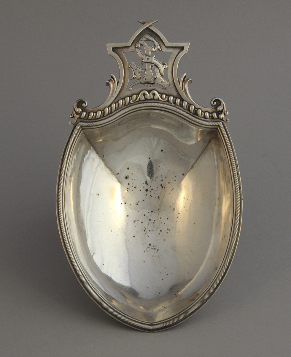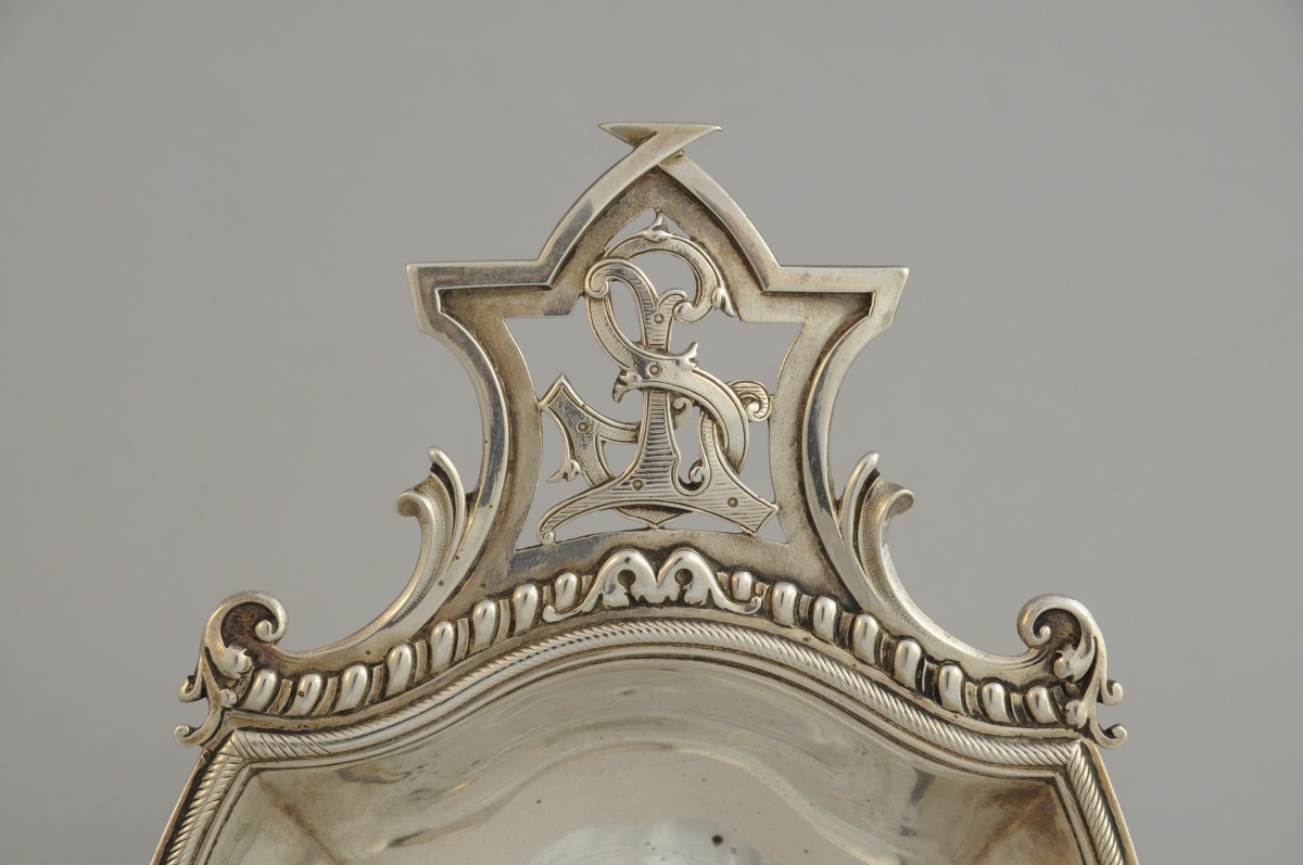 RAVIER de forme lancéolée en argent. Le rebord et le pied agrémentés d'une frise de câble. La prise ajourée d'un monogramme "SL" soulignée de godrons et rinceaux.