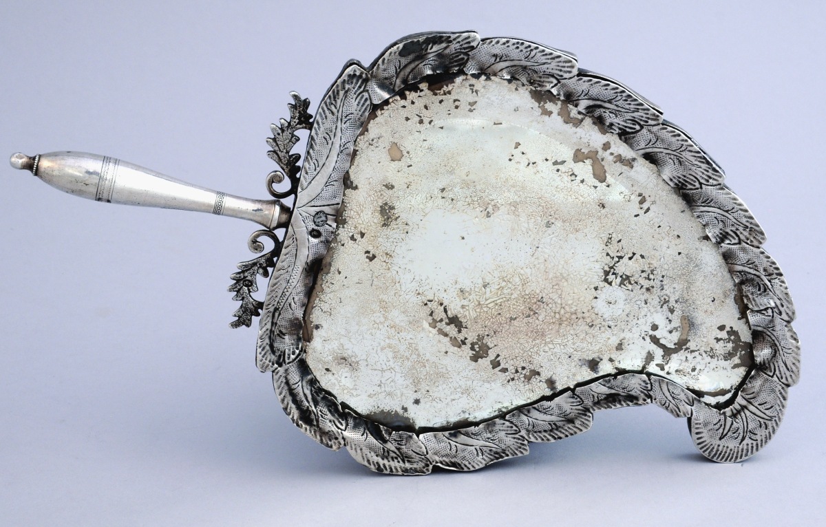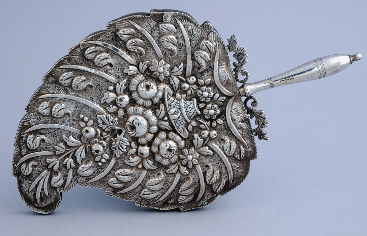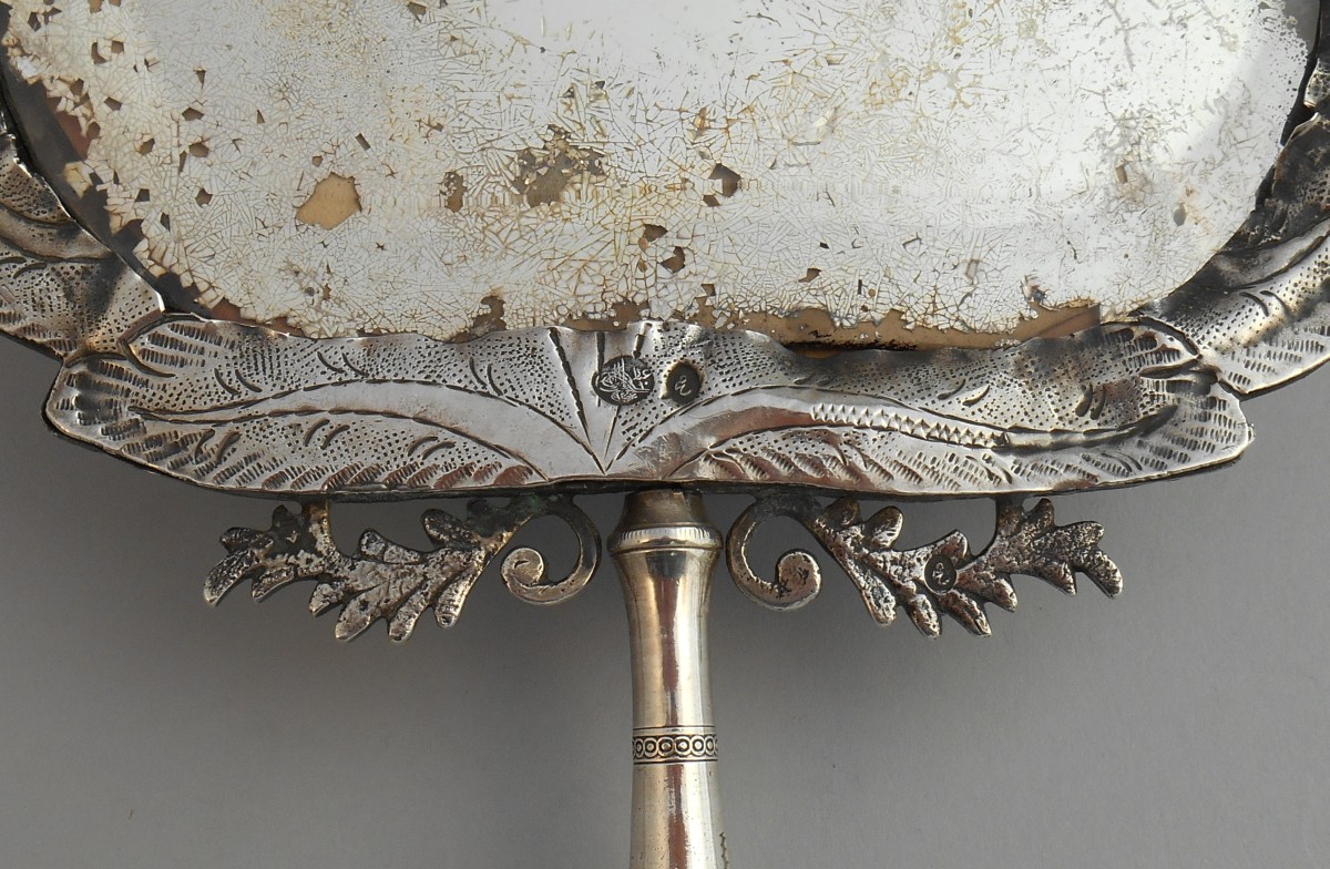 ORIENT. FACE À MAIN adoptant la forme d'une feuille assymétrique. Le rebord du miroir orné de feuillages. Le dos à riche décor repoussé et ciselé d'un panier de roses sur fond amati. Manche balustre flanqué de rinceaux en partie supérieure. Miroir biseauté au mercure (manques et usures au tain)