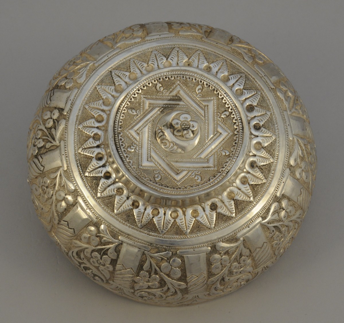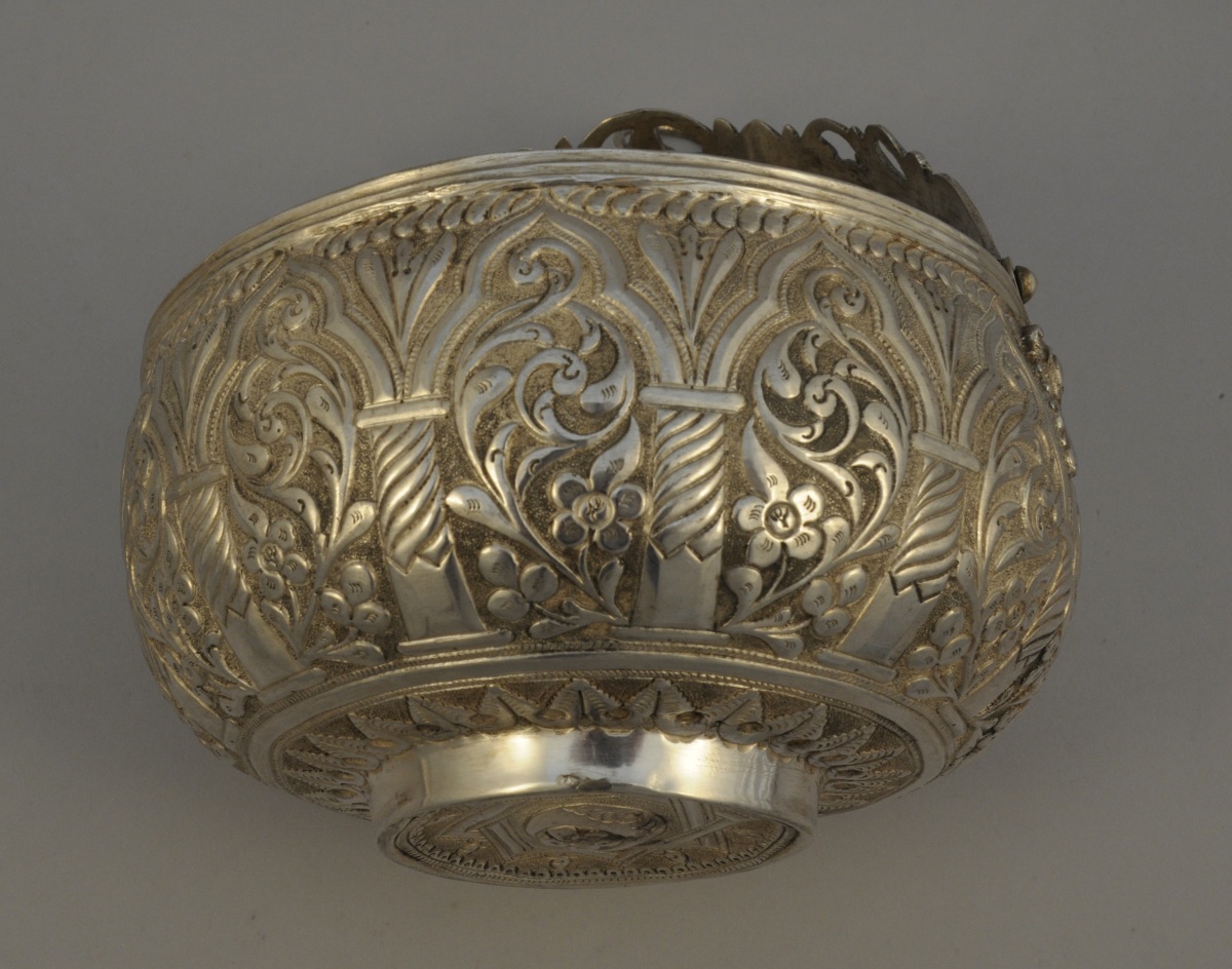 ORIENT. SEAU À BISCUITS en argent. Riche décor circulaire repoussé de rinceaux et de fleurs dans une arcade. L'anse ajourée d'une étoile et de feuillages. Petit pied circulaire orné d'une étoile à huit branches dite "andalouse" centrée d'un croissant et d'une fleur.