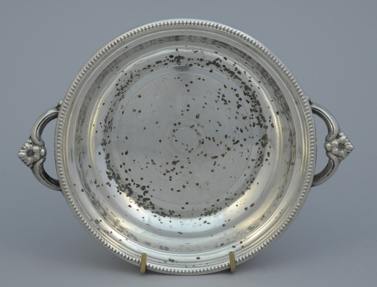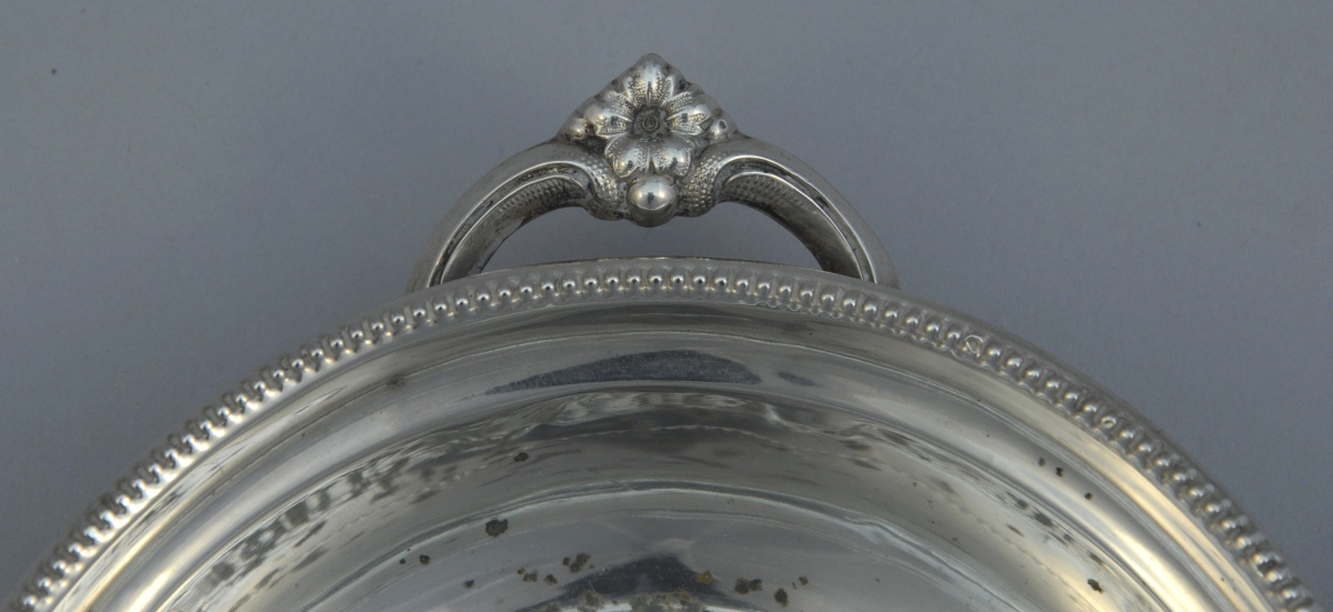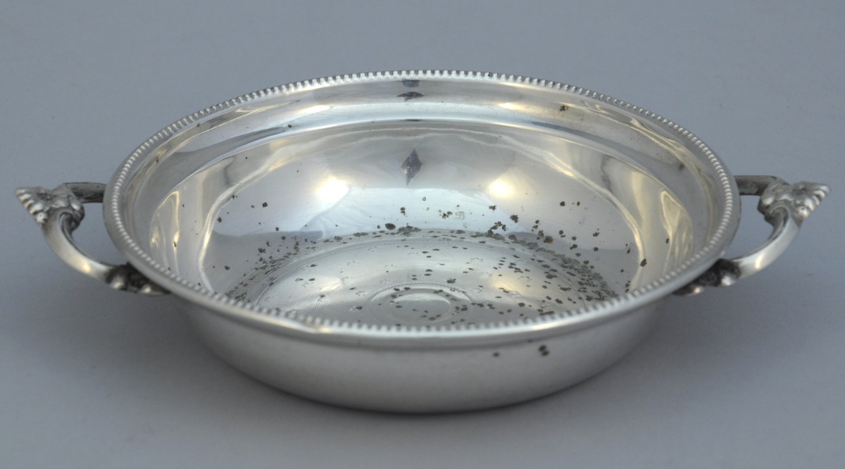 PETITE COUPE de forme ronde à fond plat en argent. Bordure ornée d'unr frise de rais de perles. Le bassin ciselé de guillochis et fleurettes. Anses latérales agrémentées d'un fleuron.