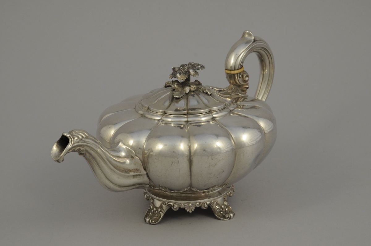 THÉIÈRE en argent. La panse renflée à côtes de melon. Ornementation de volutes feuillagées, palmettes et coquille. L'anse baguée d'ivoire figurant une agrafe. Le fretel en forme fleur épanouie sur une terrasse de fruits et feuilles de pavot. Repose sur quatre pieds à enroulements.