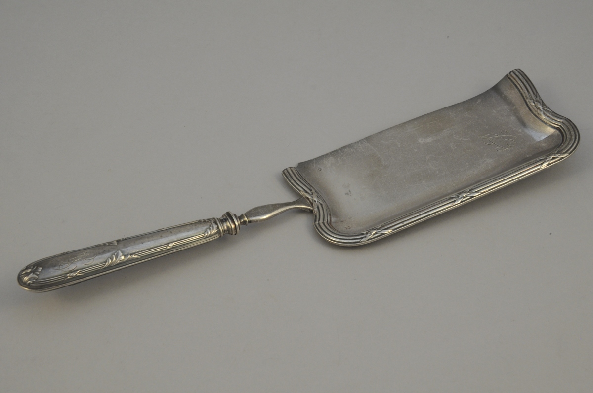 RAMASSE-MIETTE, pelle et plateau en argent. Les contours et le manche de la pelle ornés d'une frise de joncs rubannés. L'anse du plateau à décor de feuilles d'acathe stylisées et branches de laurier. Monogrammé "EV".