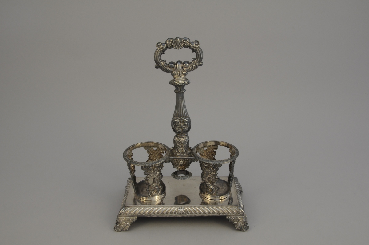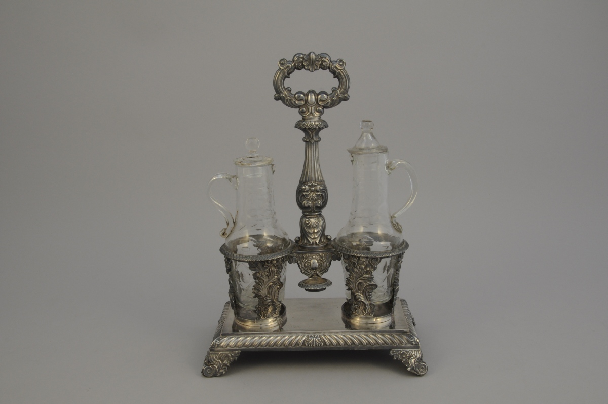 HUILIER-VINAIGRIER en argent repoussé. Riche ornementation de feuillages stylisés, coquilles et godrons. Base rectangulaire quadripode. Flacons en verre soufflé et gravé (un bouchon accidenté).