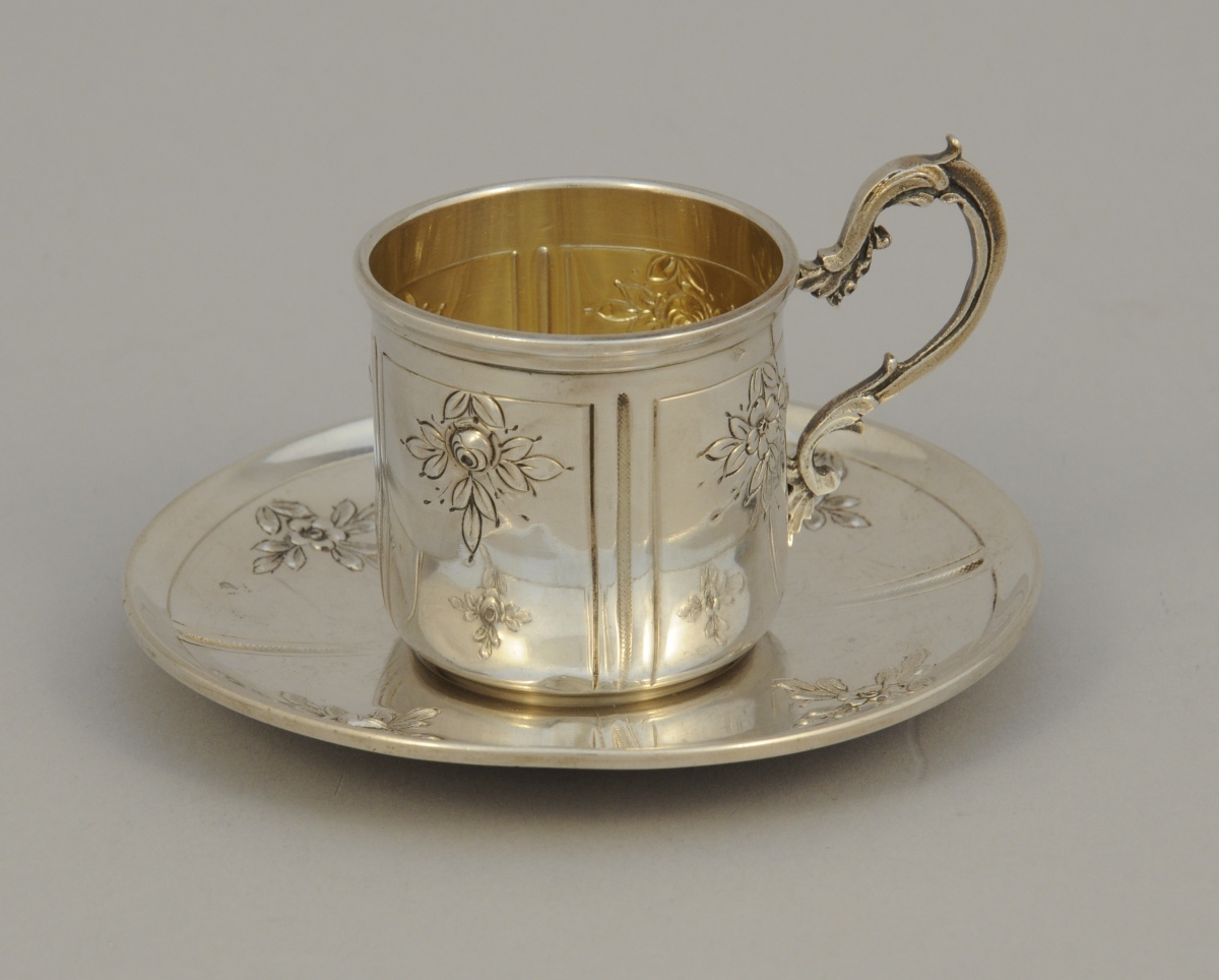 -TASSE À CAFÉ et sa SOUS-TASSE à décor de fleurs. L'anse en volute feuillagée Poinçon Minerve. Style composite, vers 1900. Haut. 6,5 cm. Poids: 115 g.