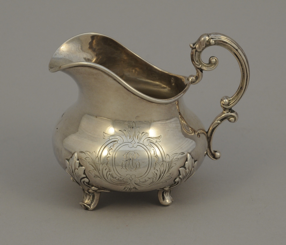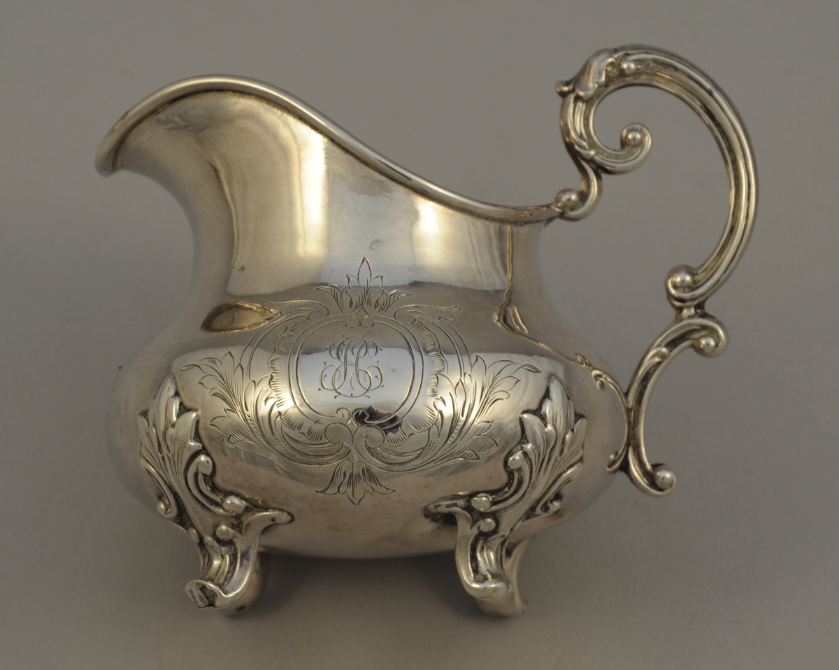 -POT-À-LAIT orné de deux cartouches flanqués de feuillages stylisés monogrammés "HE". Repose sur quatre pieds à attaches feuillagées. L'anse formée de deux agrafes. Poinçon Minerve. Style Louis XV, fin du XIXème. Haut. 8,5 cm. Poids: 95 g.