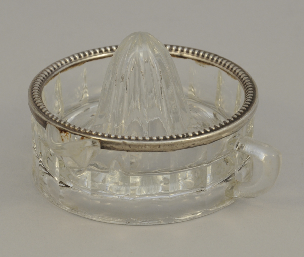 -PRESSE-AGRUMES en verre à pans coupés. Le contour cerclé d'une frise de rais de perles. Poinçon Minerve. XXème. Poids brut: 215 g.