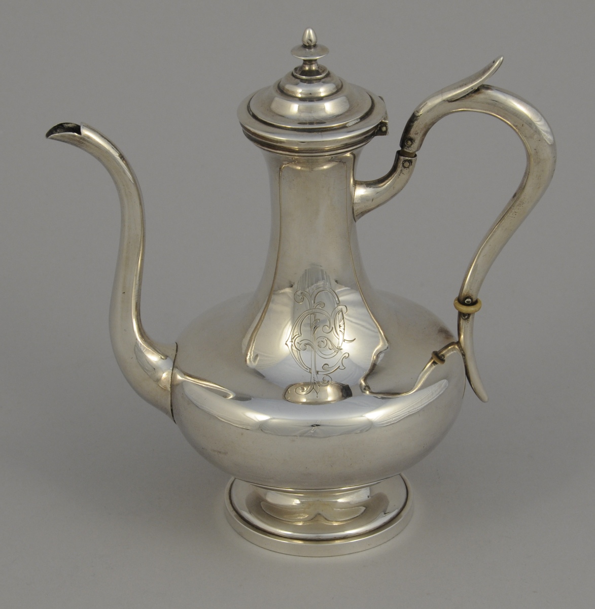 VERSEUSE ÉGOÏSTE piriforme "à l'ottomane" en argent uni reposant sur un piedouche. L'anse à deux bagues d'ivoire (?). Monogrammée PC.
