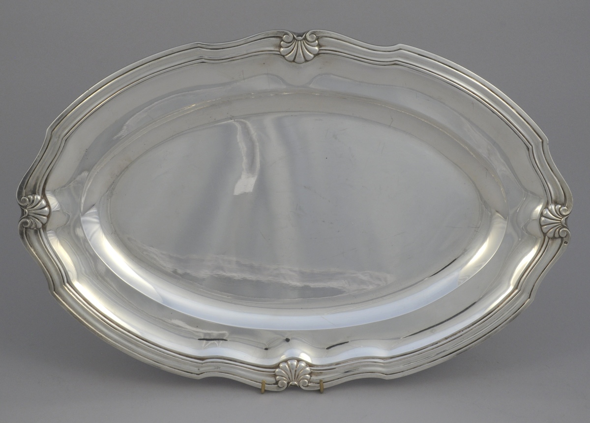 PLAT de forme oblongue en argent. Bordure chantournée ornée de filets et coquilles.