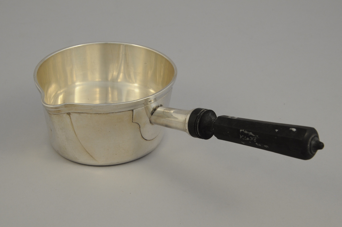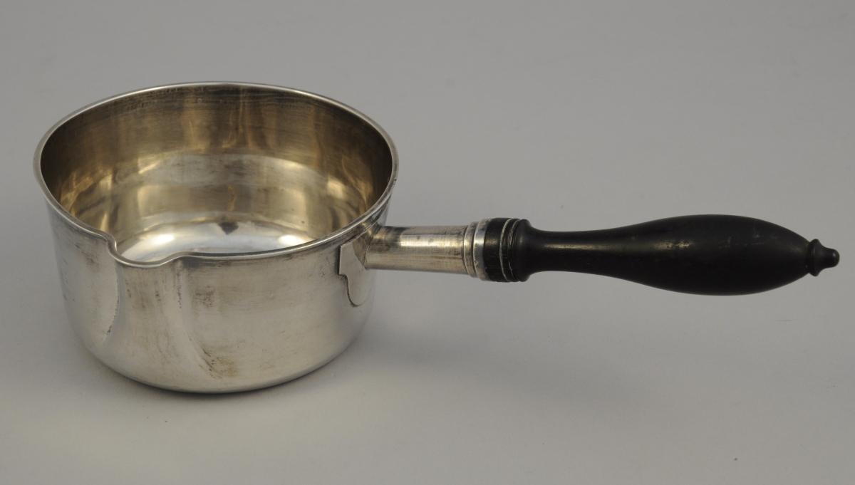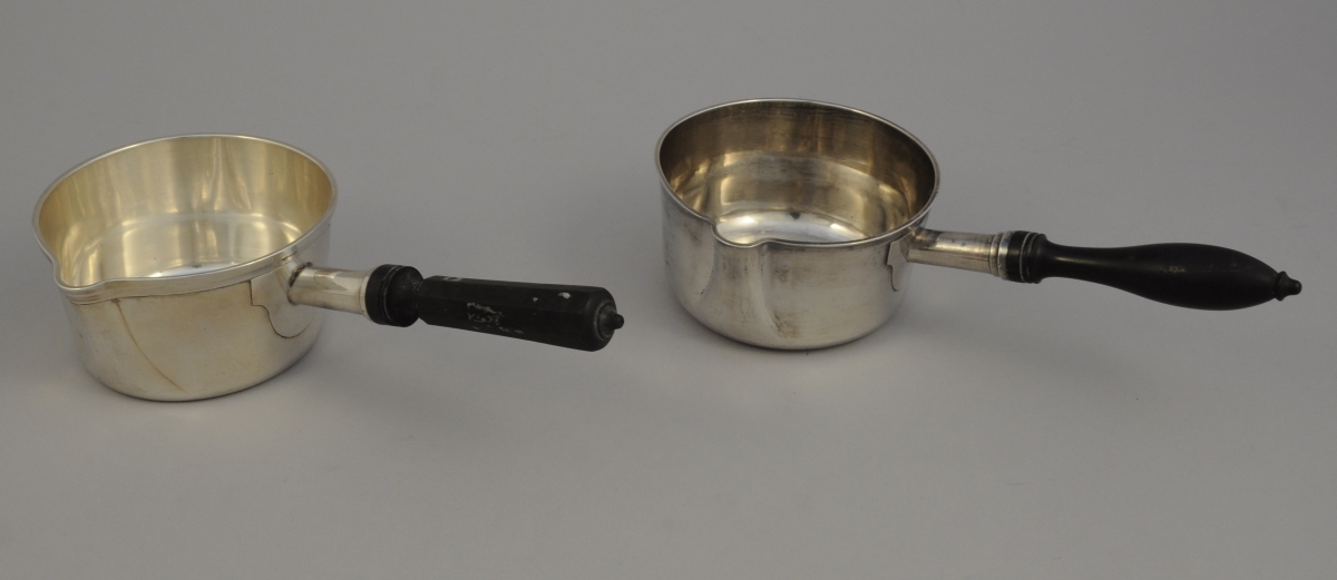 2 POÊLONS DE TABLE de forme circulaire en argent uni. Manche latéral en ébène tourné pour l'un et à pans coupés pour le second. Le premier monogrammé "BL".